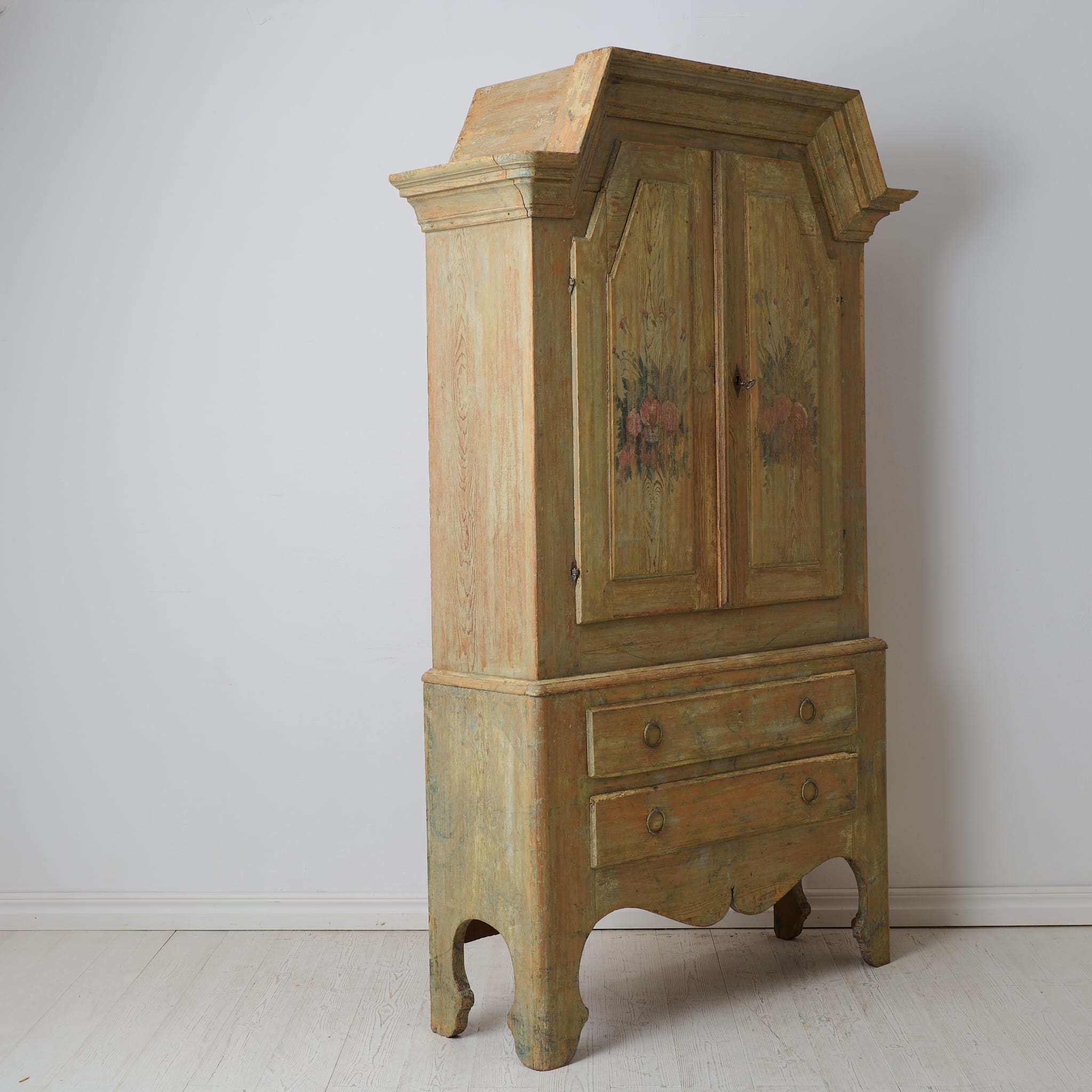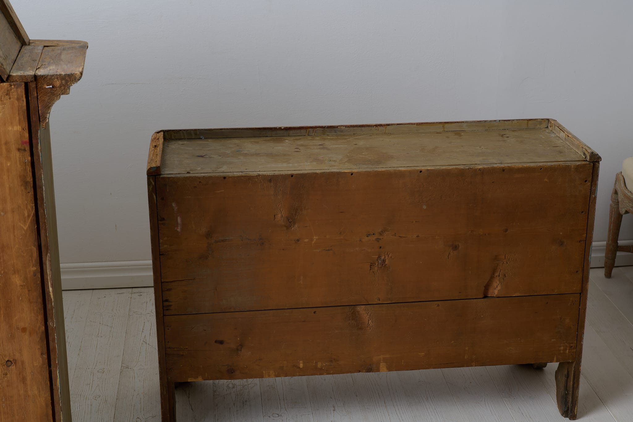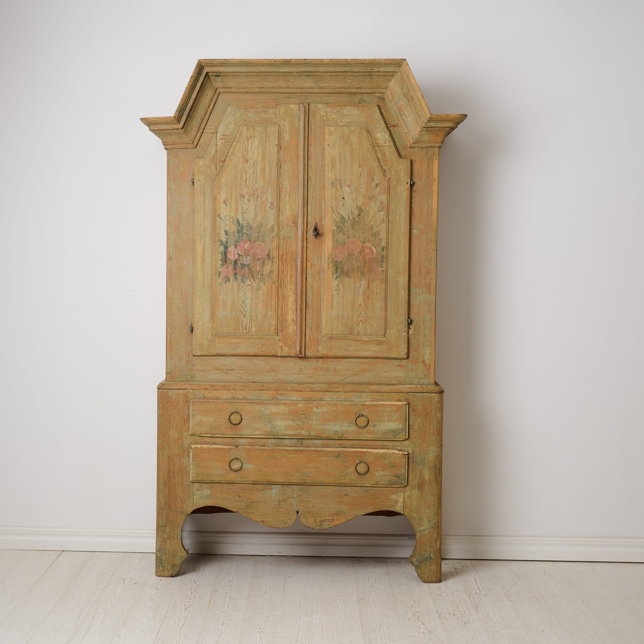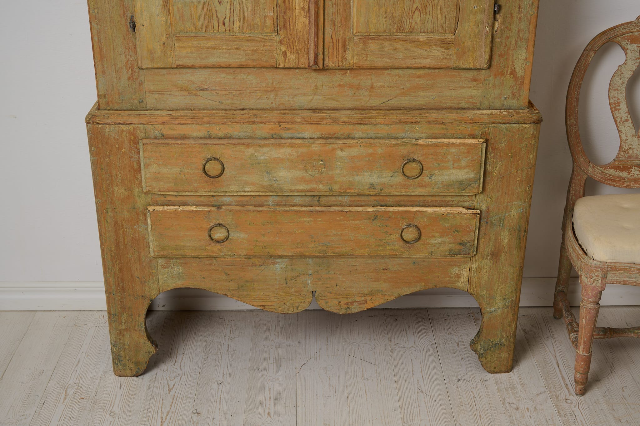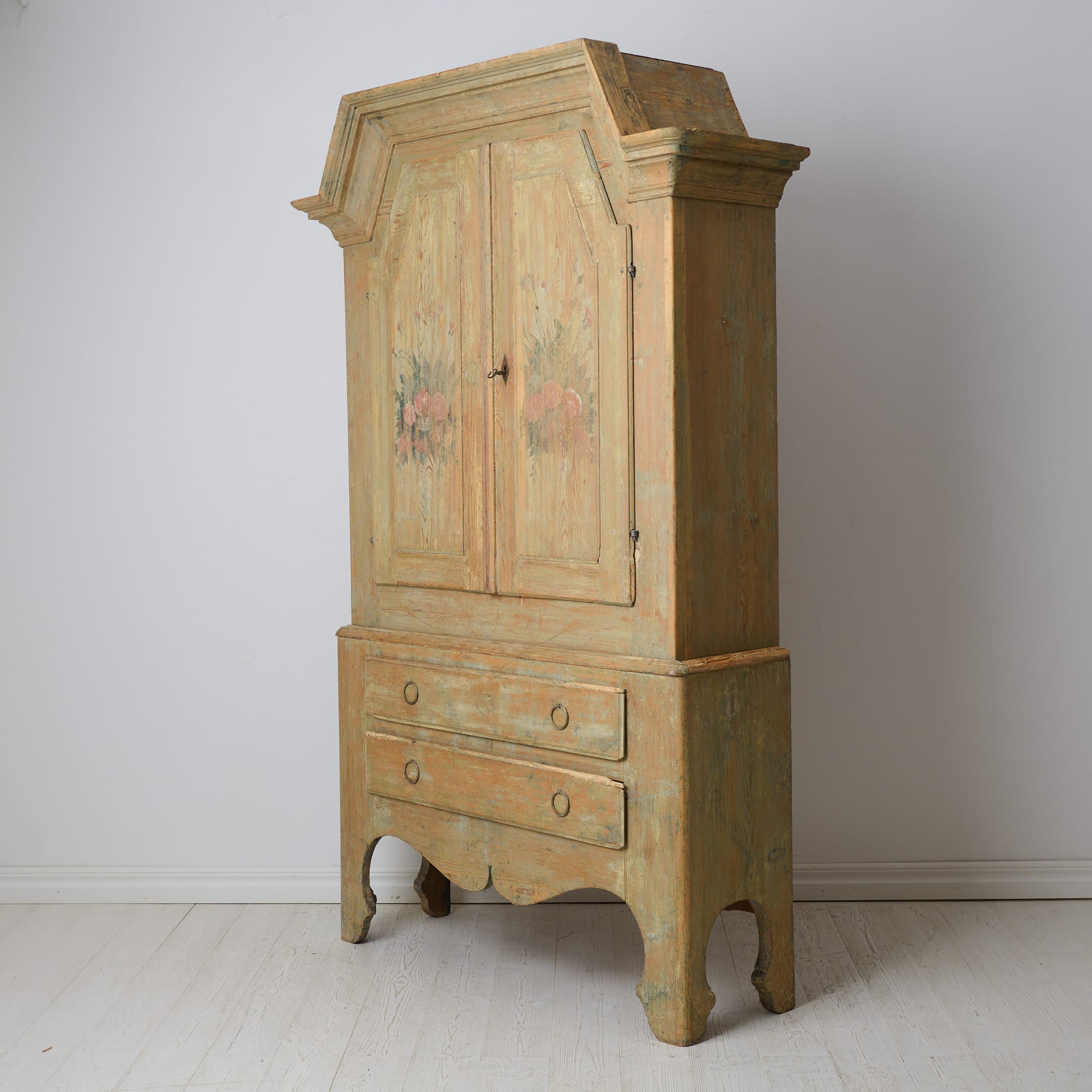 Rare folk art cabinet from northern Sweden made around 1820 to 1830. Made by hand in solid pine in two parts. Original first layer of paint from the early 1800s. The paint shows the history of the cabinet with patina and distress after use. Old working lock and key, original drawer pulls in brass to the drawers. Healthy and solid frame. Measurements are taken from the pediment.