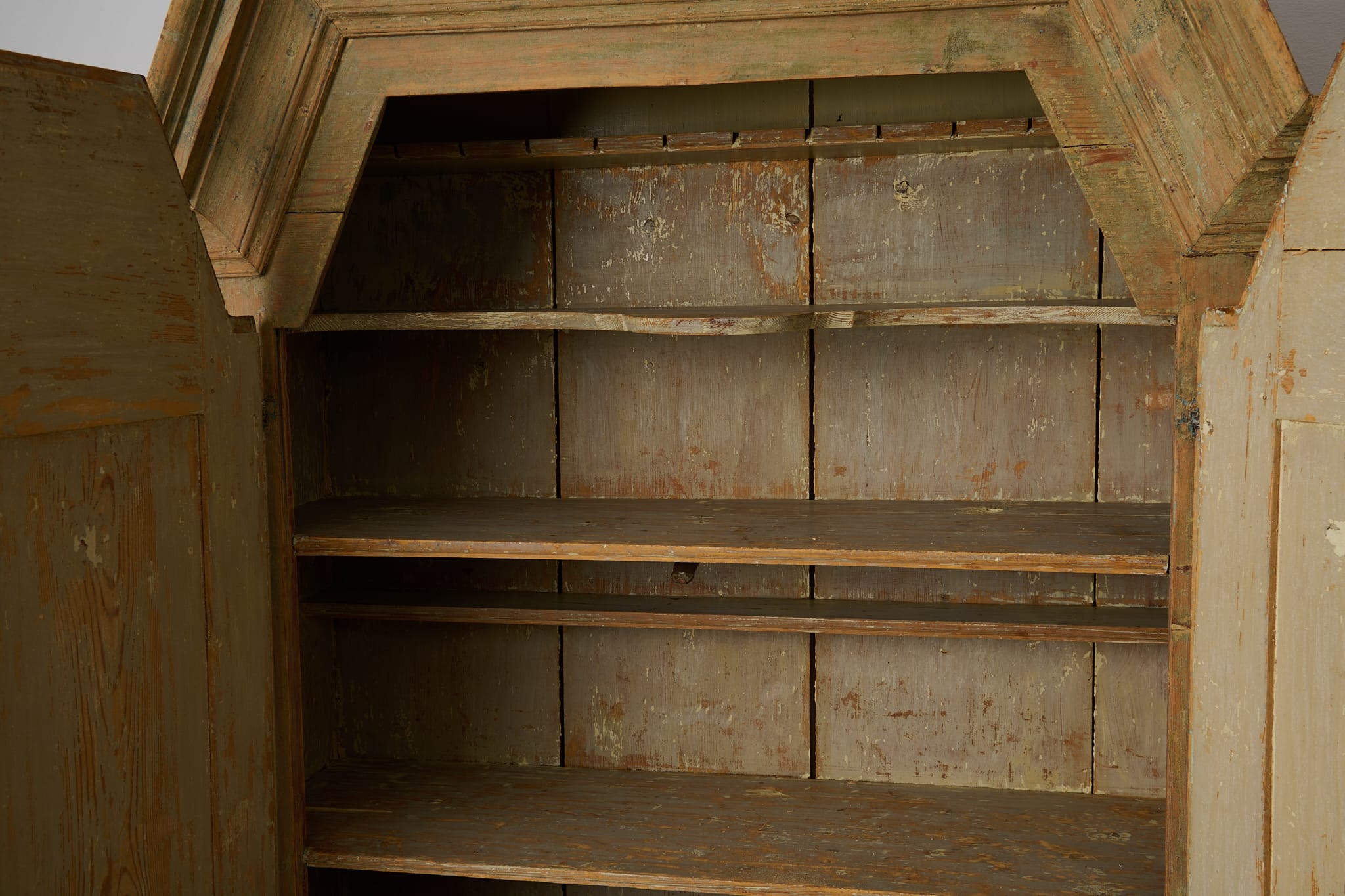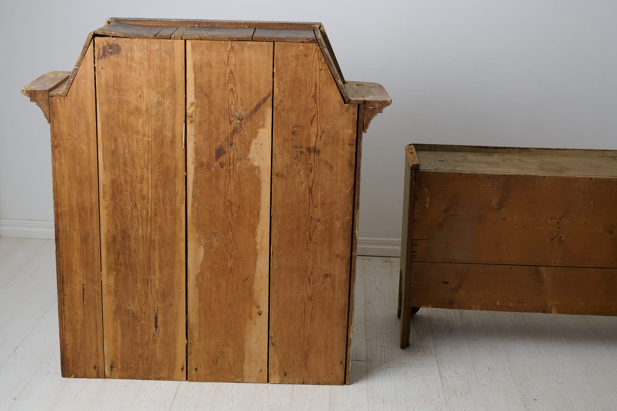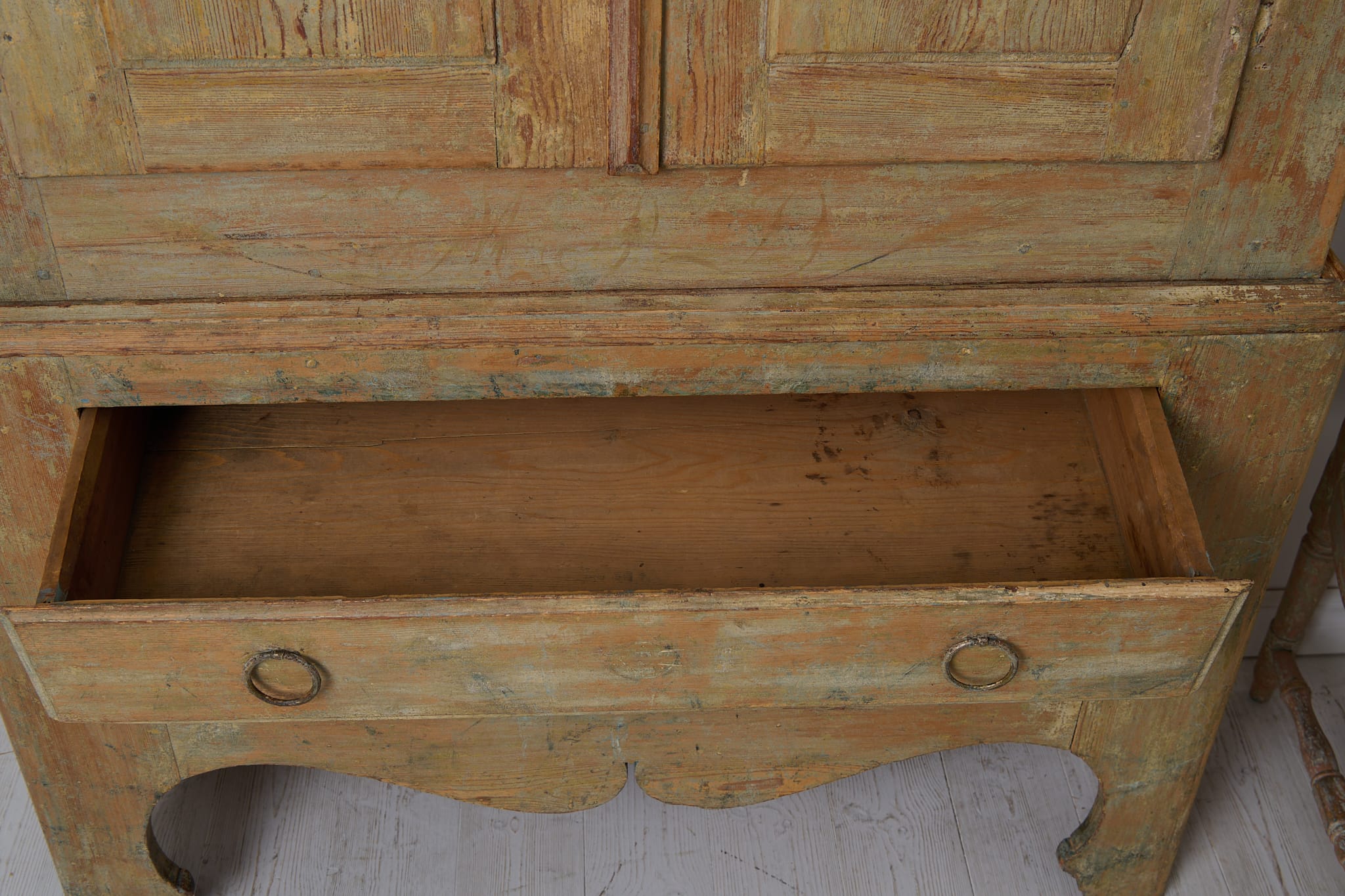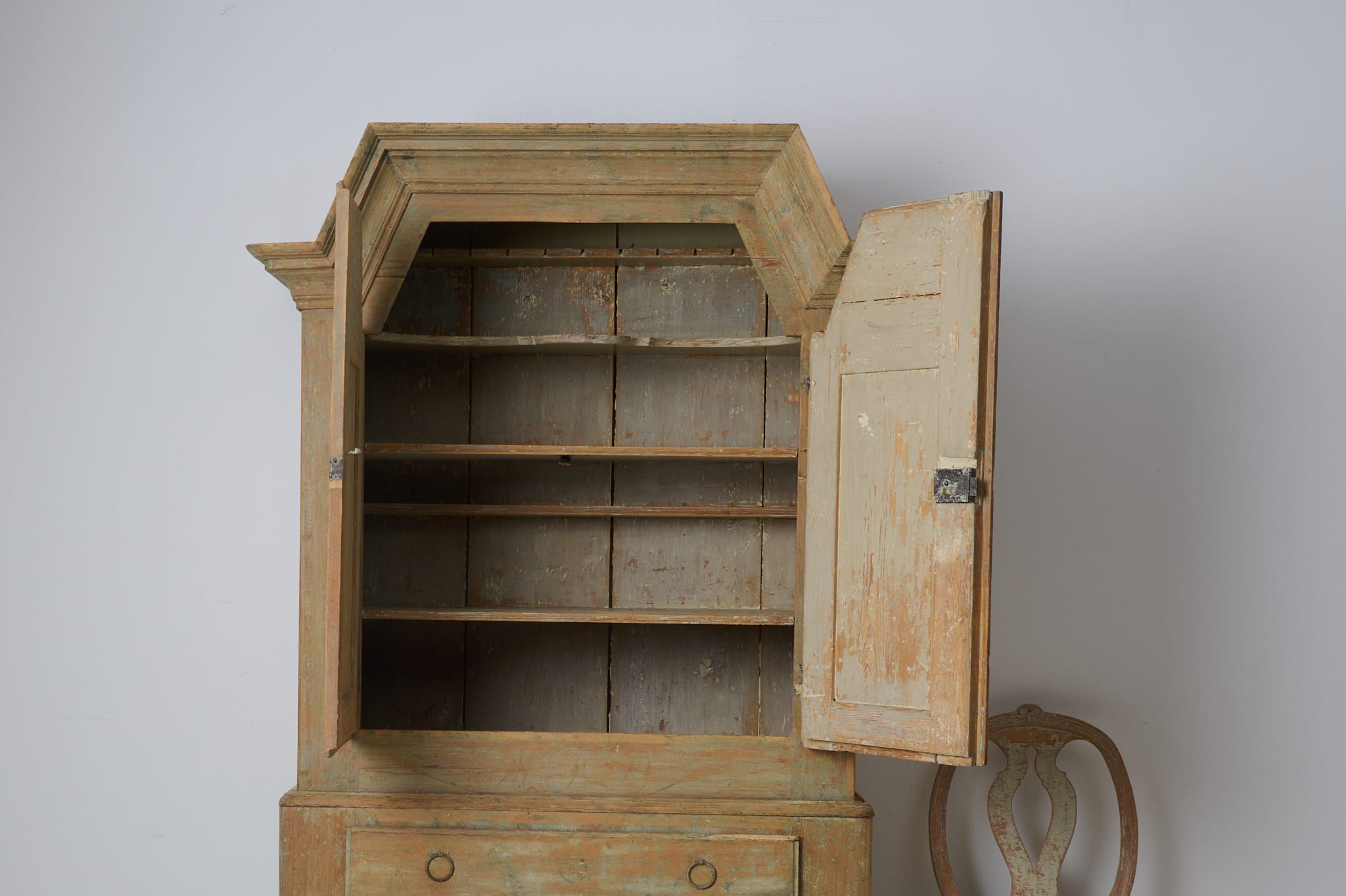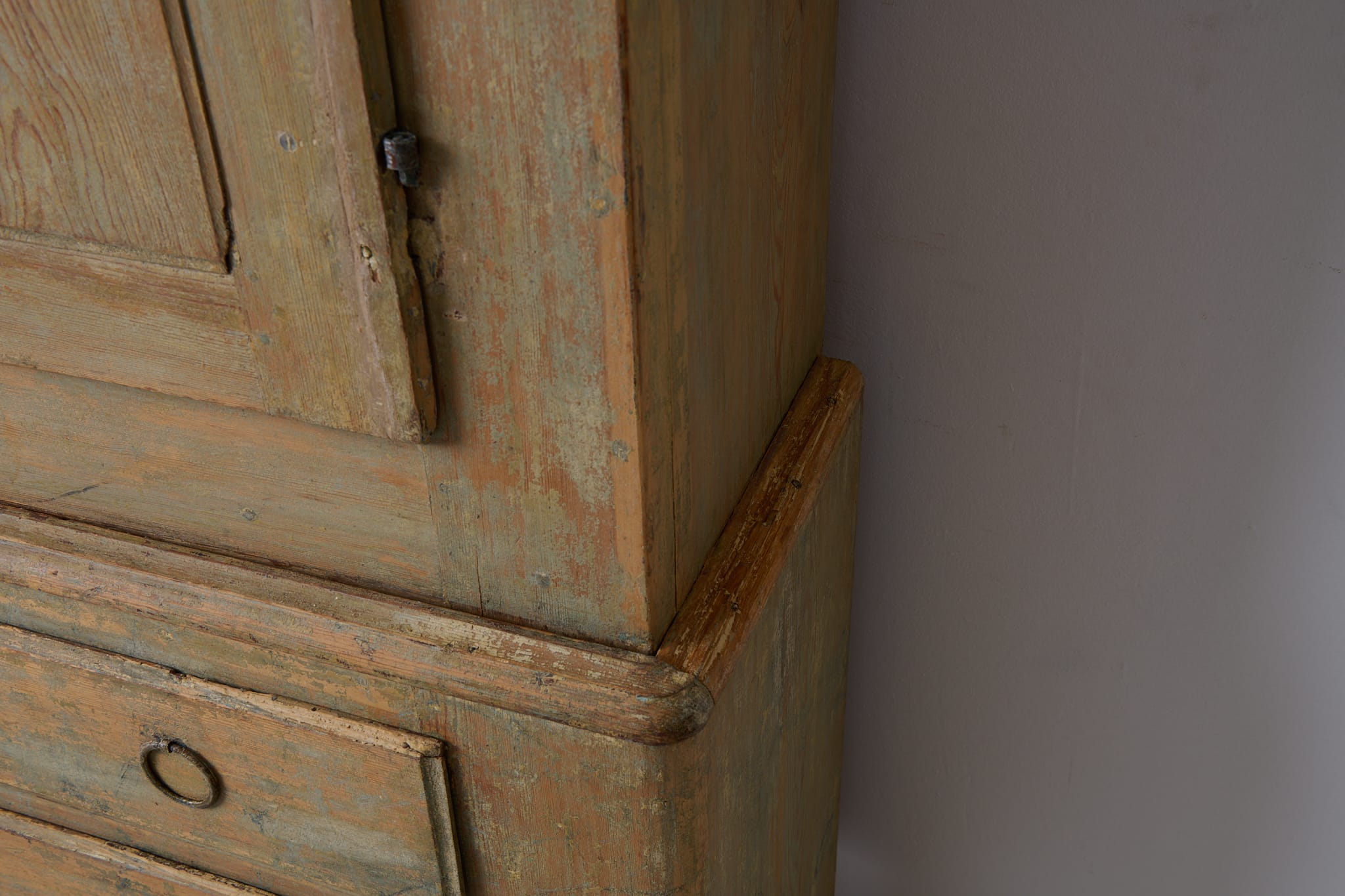 Rare folk art cabinet from northern Sweden made around 1820 to 1830. Made by hand in solid pine in two parts. Original first layer of paint from the early 1800s. The paint shows the history of the cabinet with patina and distress after use. Old working lock and key, original drawer pulls in brass to the drawers. Healthy and solid frame. Measurements are taken from the pediment.
