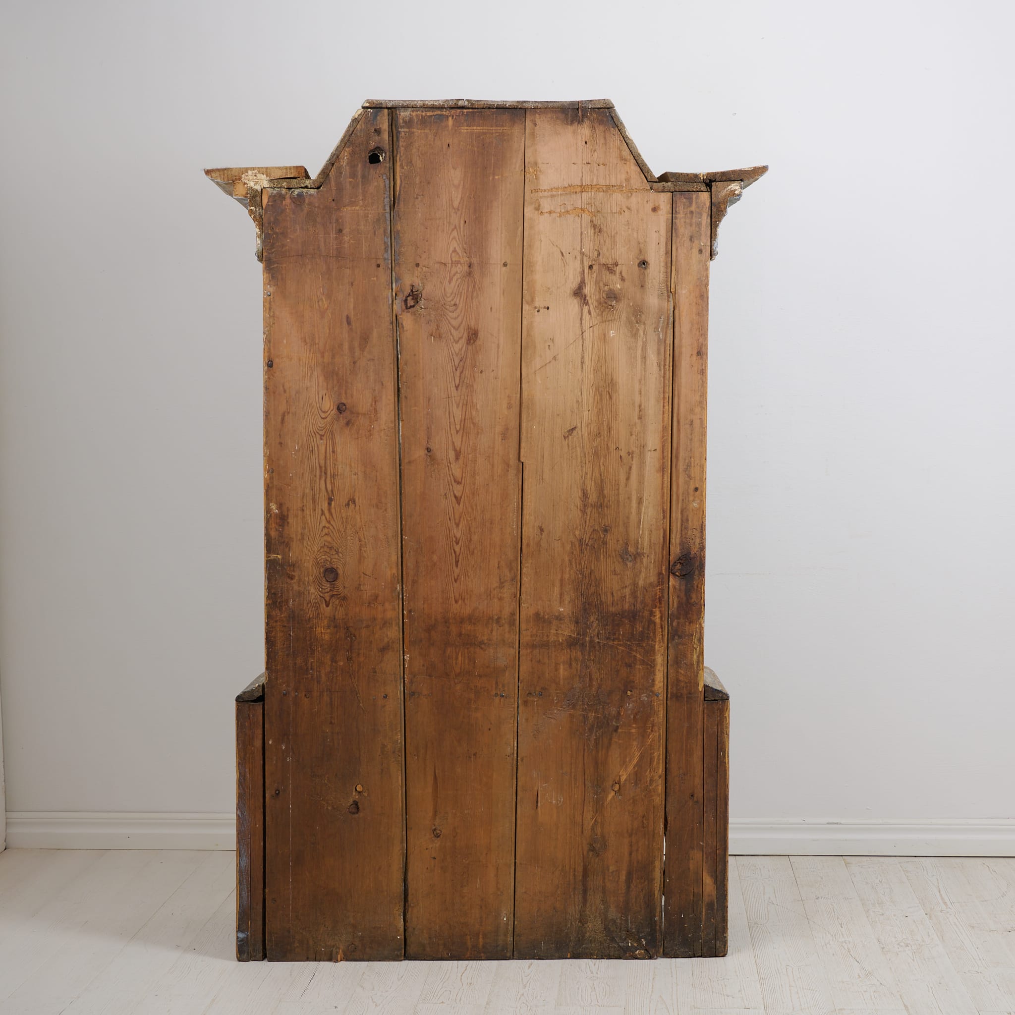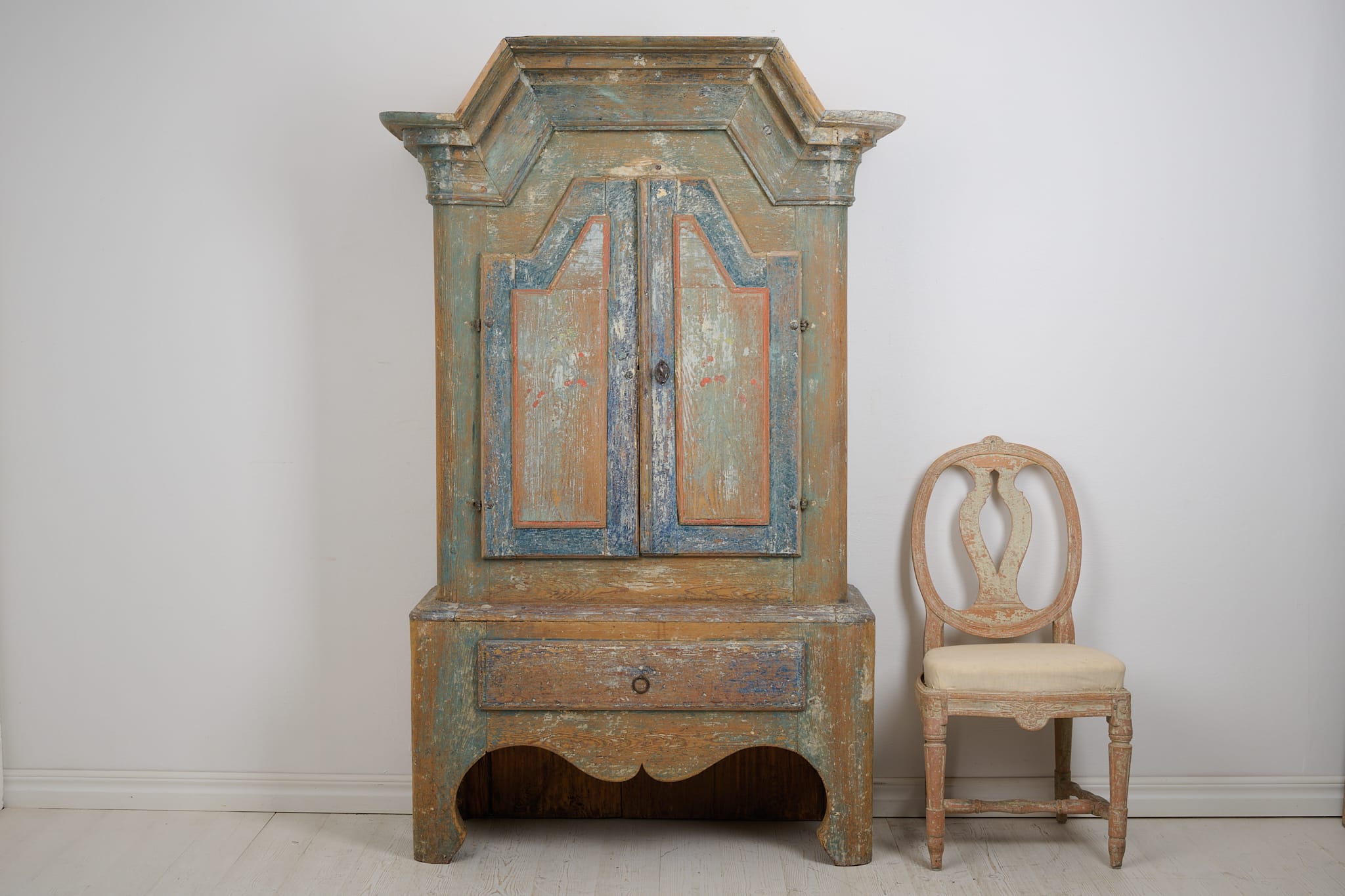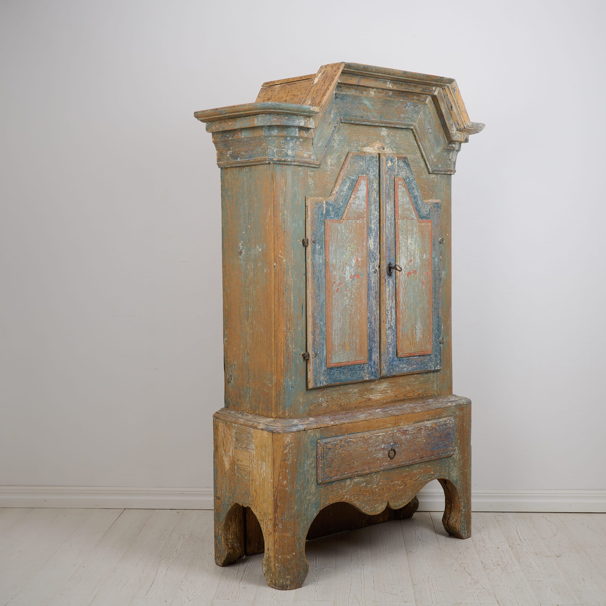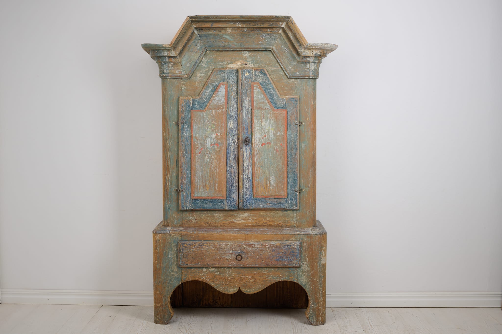 Rare folk art cabinet from Sweden made during the early 1800s. The cabinet is made by hand in northern Sweden, in the county Jämtland, from solid pine around the turn of the century 1700 to 1800. Baroque style with an angular pediment and double doors. The cabinet is made in one single piece. Scraped to original paint with distress and patina – the wood shines through in places that are more worn. The inside has shelves as well as paint from the late 1800s. Working lock and key.