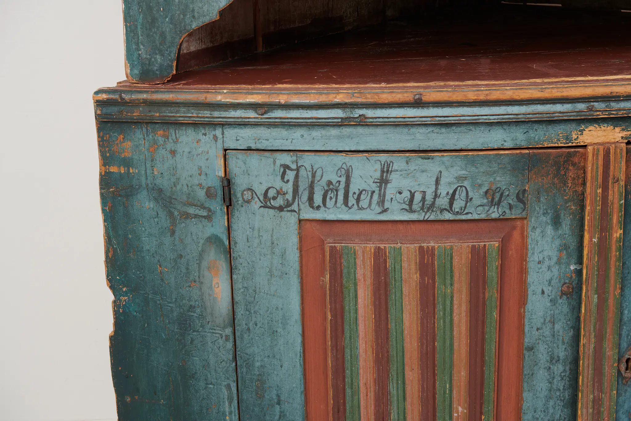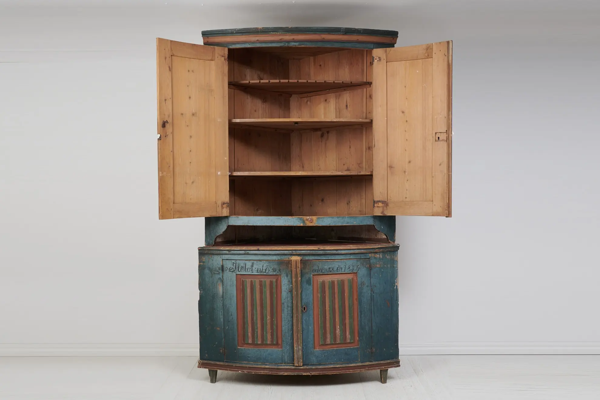 Rare untouched corner cabinet from Sweden in gustavian style. This antique corner cabinet is from Hälsingland in central Sweden. Made by hand in solid Swedish pine the cabinet has its original paint and is dated 1845. There is also a set of owner’s initials on the top of the door. As this is an untouched furniture that is 200 years old there are marks and traces of use where the cabinet has travelled through the centuries. But the frame is healthy and solid.