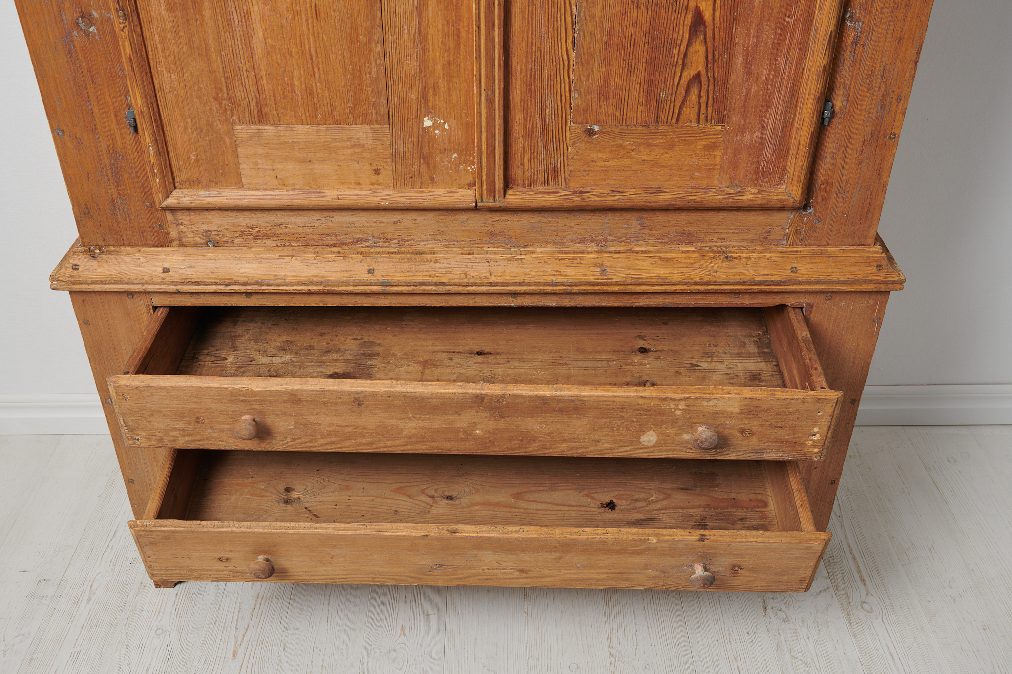 Antique folk art cabinet from Sweden made during the first years of the 19th century, around 1810. The cabinet is made by hand in solid pine. The cabinet has a rustic surface with bare pine wood where the grain of the wood is visible. The joints are also visible which shows the craftsmanship of the piece. Made in two parts.