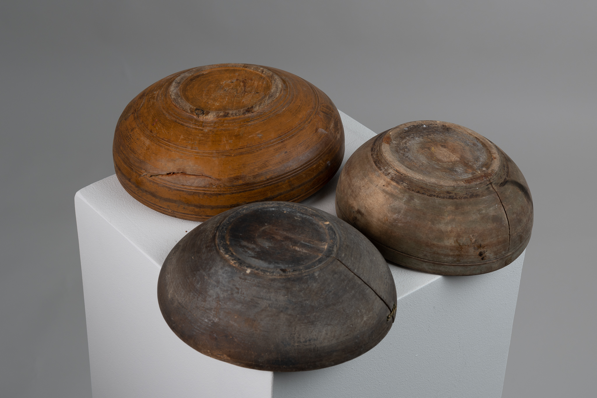 Antique turned wood bowls from northern Sweden. The bowls are mid 19th century and were used for the storage and preparation of food. The frequent use mean that they are difficult to find today because most didn’t last. They are even harder to find in good condition. Set of 3. They all have some minor dry cracks.