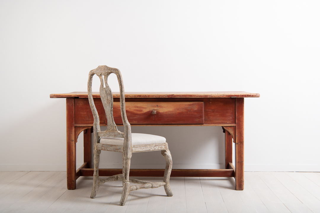 Baroque and folk art table from the late 18th century. From northern Sweden with a good rustic patina. Untouched original condition with original paint. Natural wear after 250 years of use. The table top is unusually thick and made of two wide boards – see picture. Healthy and solid frame. The table top is loose on the frame and locks in place with the help of wooden joists underneath. Height to rim is 52.5 cm.