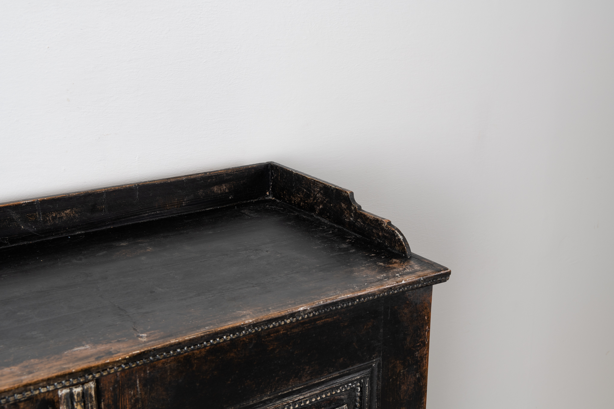 Black gustavian sideboard from Sweden made around 1790. The sideboard has two doors and a profiled bottom rim. Made in painted pine and an unusually low model, rich with hand carved wooden decorations on the doors and around the edges. Original lock and key in working condition and original hardware. Healthy and solid frame. Height to the table top is 104 and the total height including the 7 cm rim is 111 cm.