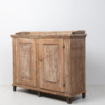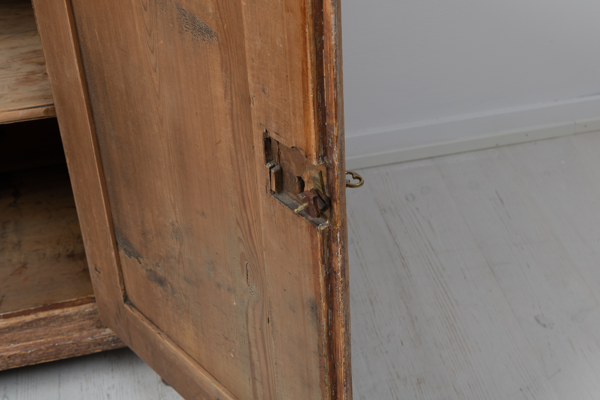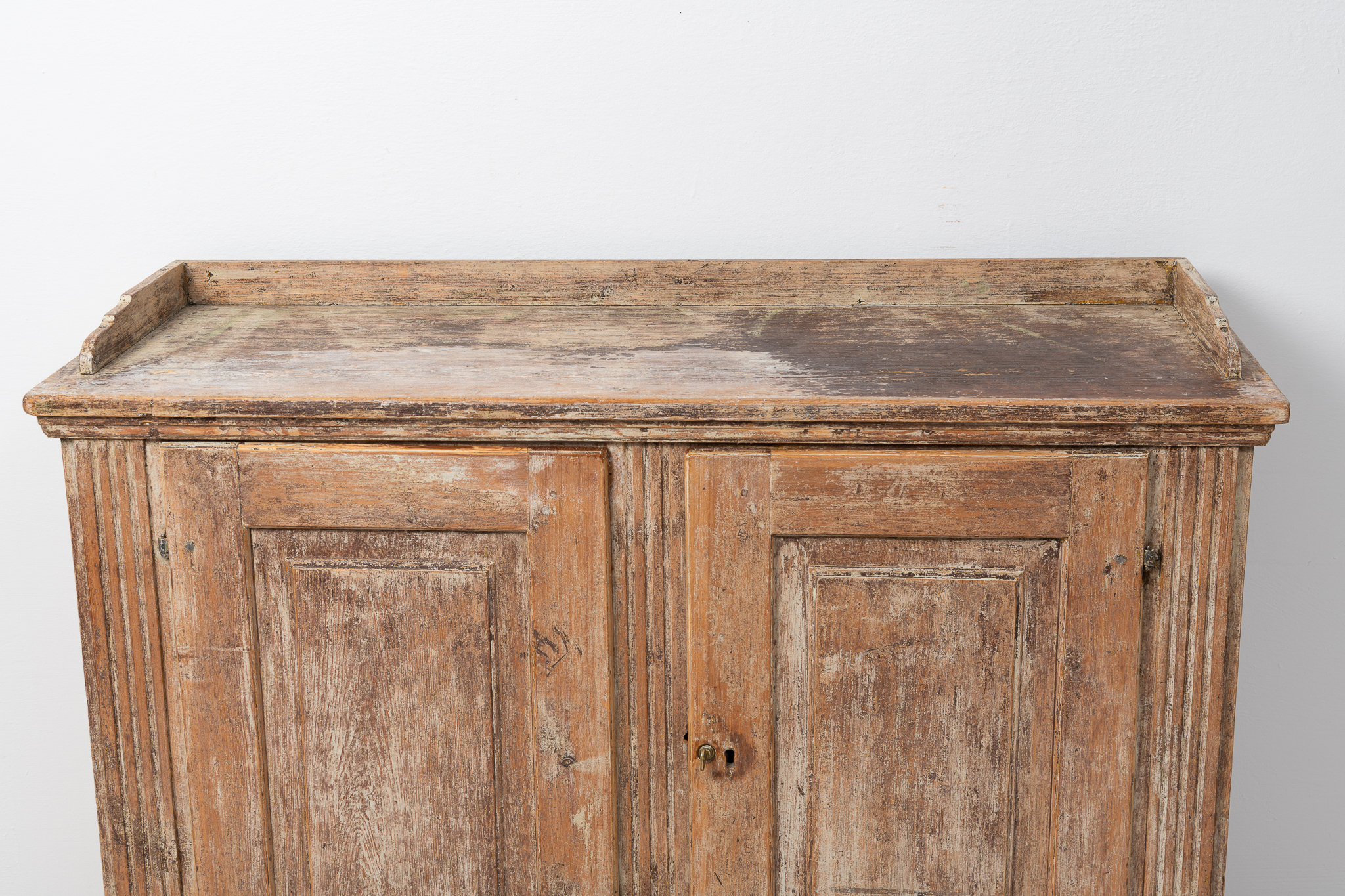 Genuine Swedish antique sideboard in gustavian style made during the last years of the 18th century, around 1790 to 1800. The sideboard is from Northern Sweden and has a frame in solid pine with two doors. Inside it has both shelves and drawers. The sideboard has the classic gustavian features with a straight and simple shape as well as hand carved flutes at the corners. The surface is rustic with patina after over 200 years of use. Healthy and solid frame. The lock is missing and has been replaced with a latch sometime during the latter part of the 1800s. Height to the table top is 104 cm and the edge is another 6 cm.
