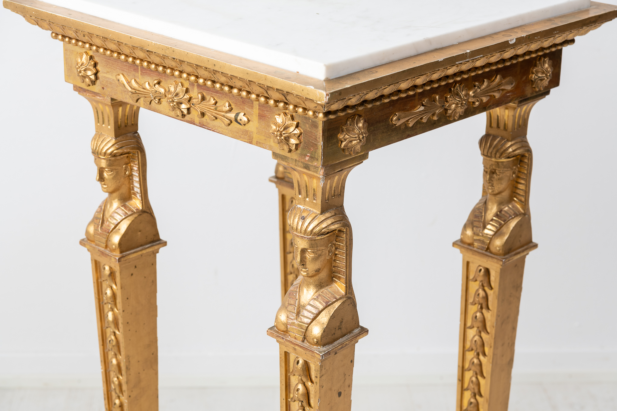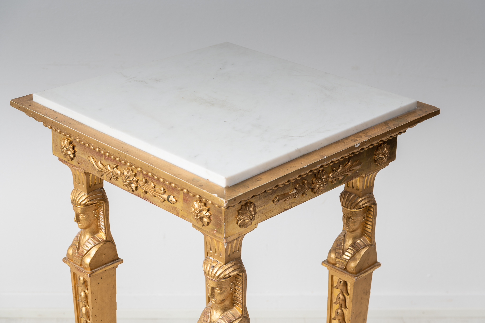 Gilded empire pedestal or geridong from the mid 1800s, around 1840. The pedestal is from Sweden and is gilded with a white marble top in Carrara marble. The pedestal is in good vintage condition consistent with age with some smaller traces of use. There is some loss of paint on the black plinth.