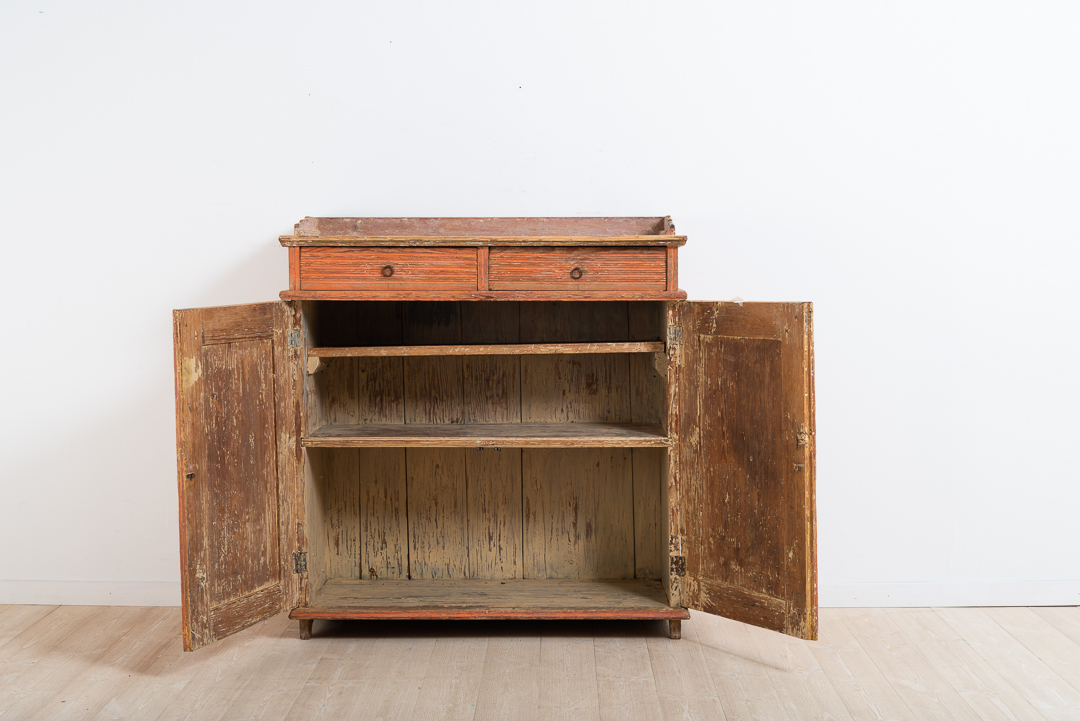 Gustavian sideboard with decorative diamonds on the doors. Dry scraped original paint. Newer hinges from the mid-19th century. Manufactured in Sweden between 1790 and 1800. The wood is healthy and the frame is solid. The sideboard is a genuine antique and will therefor have some imperfections due to age and use.