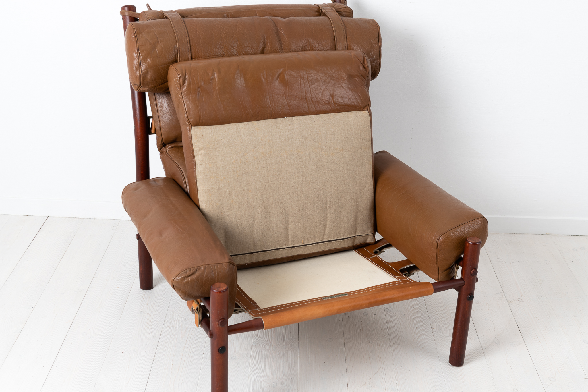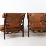 Inca armchairs by Arne Norell designed 1971. The pair of armchairs have upholstery in buffalo leather and frames made from birch. Manufactured by Norell Möbler during the 1970s. Frames held together with only strong leather straps, they are completely without screws or glue. The chairs are in good vintage condition consistent with age and use.