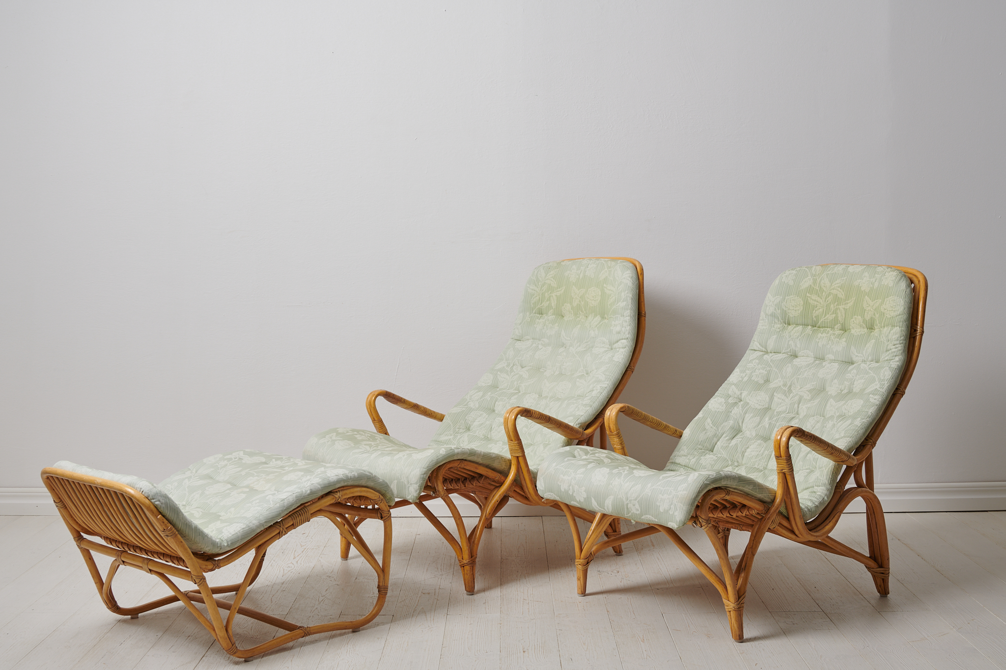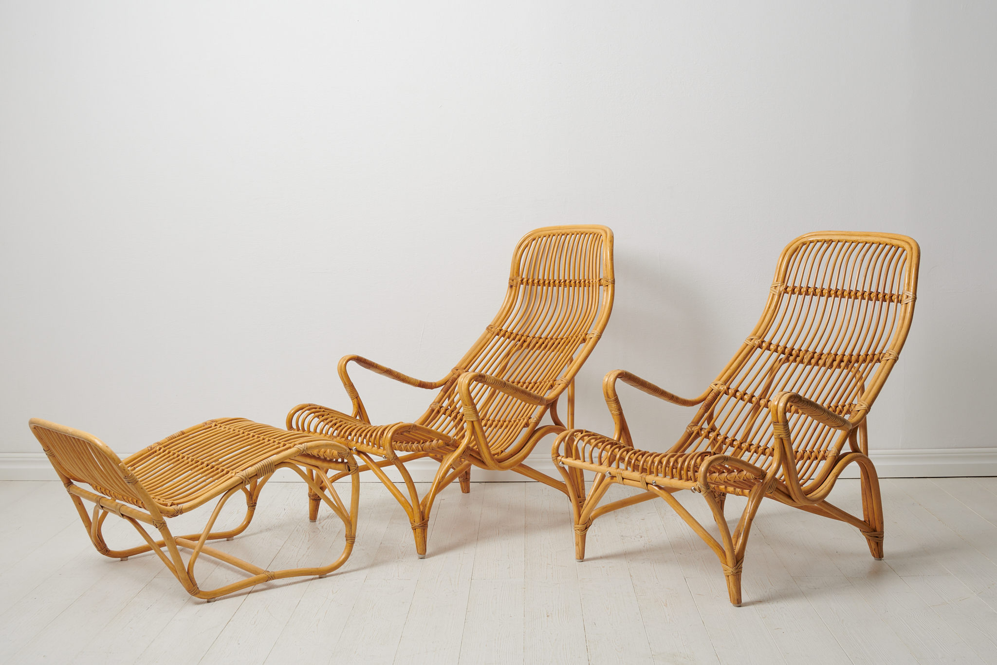 Lounge chairs by Bruno Mathsson in rattan. Indulge in luxury with this pair of iconic lounge chairs by Bruno Mathsson, a rare pair in rattan accompanied by a footstool for DUX. This model, with its distinctiveness, was produced in limited numbers during the early 1970s.