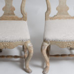 Pair of Swedish rococo chairs from the late 18th century, 1780 to 1790. The chairs are northern Swedish and dry scraped to the original paint from the late 1700s. The chairs have their origin in Västerbotten in Northern Sweden. They have the local carpenters own personal and charming interpretation of the rococo style during the late 1700s. Slightly exaggerated shapes in comparison to chairs made in the capital Stockholm but clearly from the same period. Healthy and solid with new padding and new upholstery in linen fabric. The seat is 42 x 44 cm.