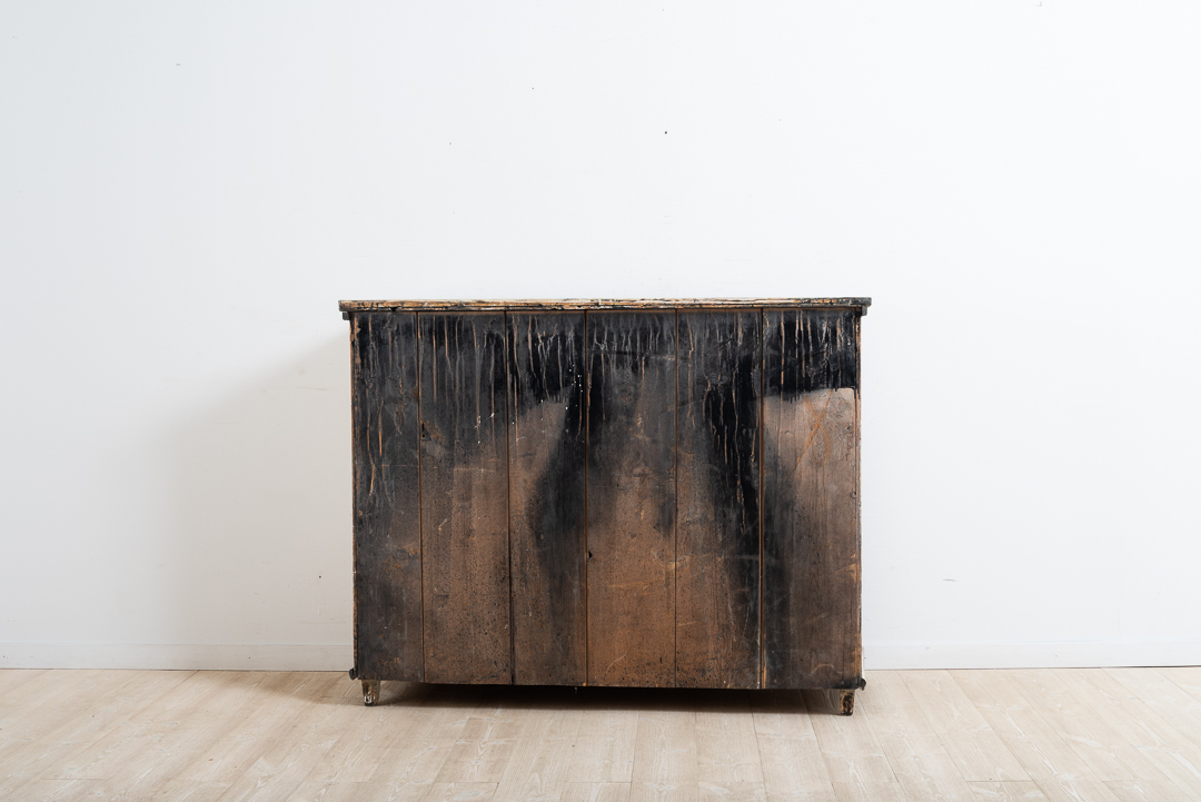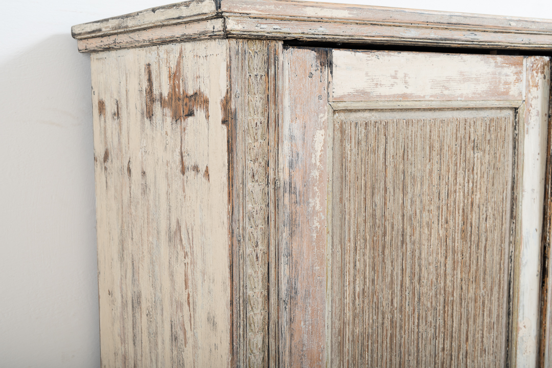 Provincial gustavian sideboard from Västerbotten in northern Sweden. Made around the year 1800. Fluted doors and angled corners with carved wooden decor. Dry scraped. Original working lock and key.
