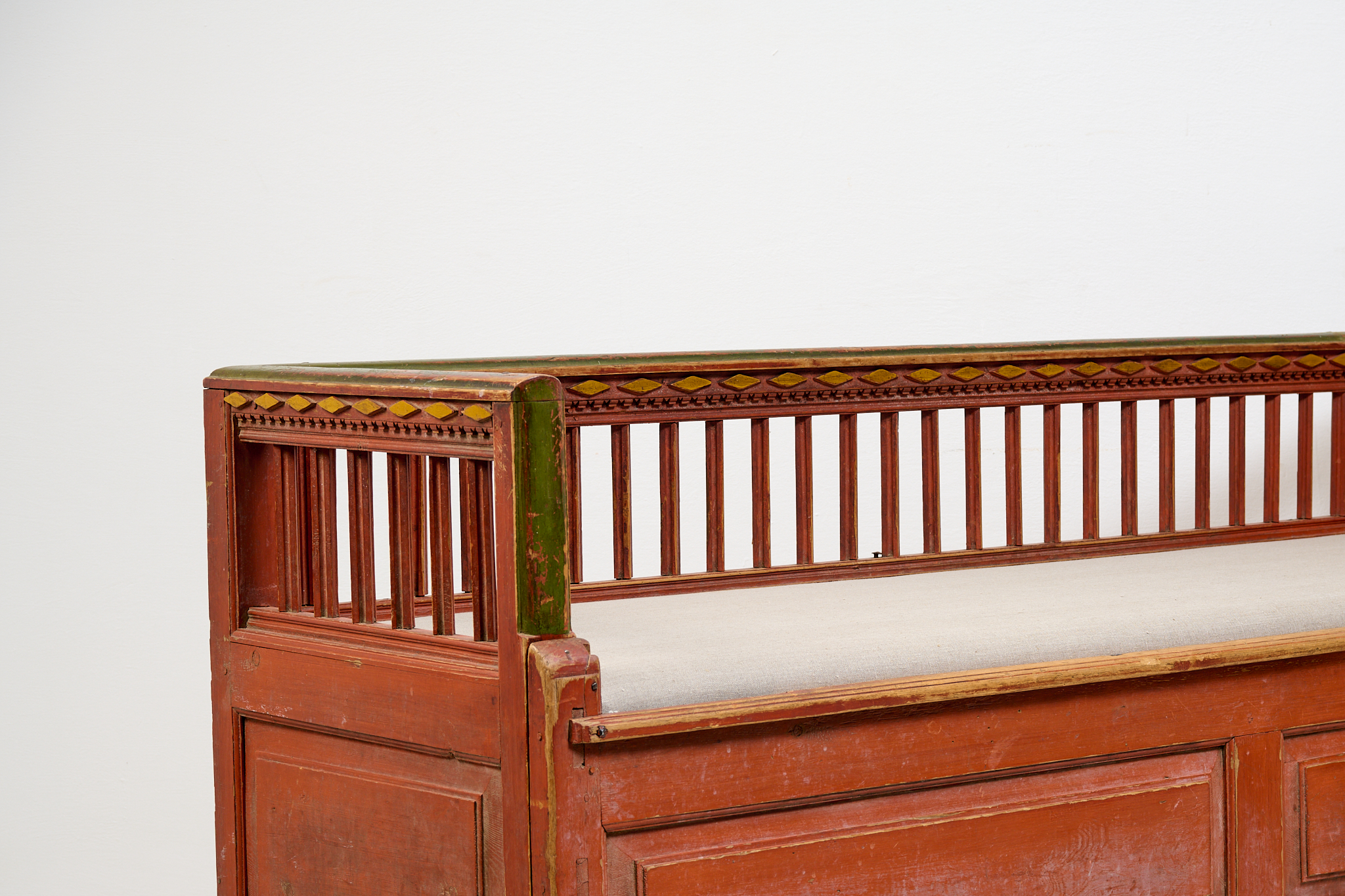 Rare folk art bench or sofa from northern Sweden, unusually well-crafted with decorative panels and sculpted legs. It features carved wooden decorations at the top of the backrest and was handcrafted in solid pine around 1820. The untouched original paint shows minor traces of use, primarily on the front of the armrests, refer to pictures. The piece is healthy and stable. The seat has been recently made with new upholstery in linen fabric. Additionally, there is a generous amount of storage space underneath the seat. The depth measurements are taken from the outer and inner side respectively.