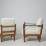 Swedish grace upholstered armchairs from the early 20th century, around 1920 to 1930 in Sweden. The armchairs are unusual and made in a style similar to that of Swedish designer Axel Einar Hjort. The chairs have a frame in stained birch and hand worked finish. Loose cushions that are renovated and reupholstered with the fabric Makalu White from Finnish Lauritzson. Makalu is a fabric woven with yarn containing wool and alpaca which creates a very soft and plush fabric. The frames are in good vintage condition consistent with age and use.