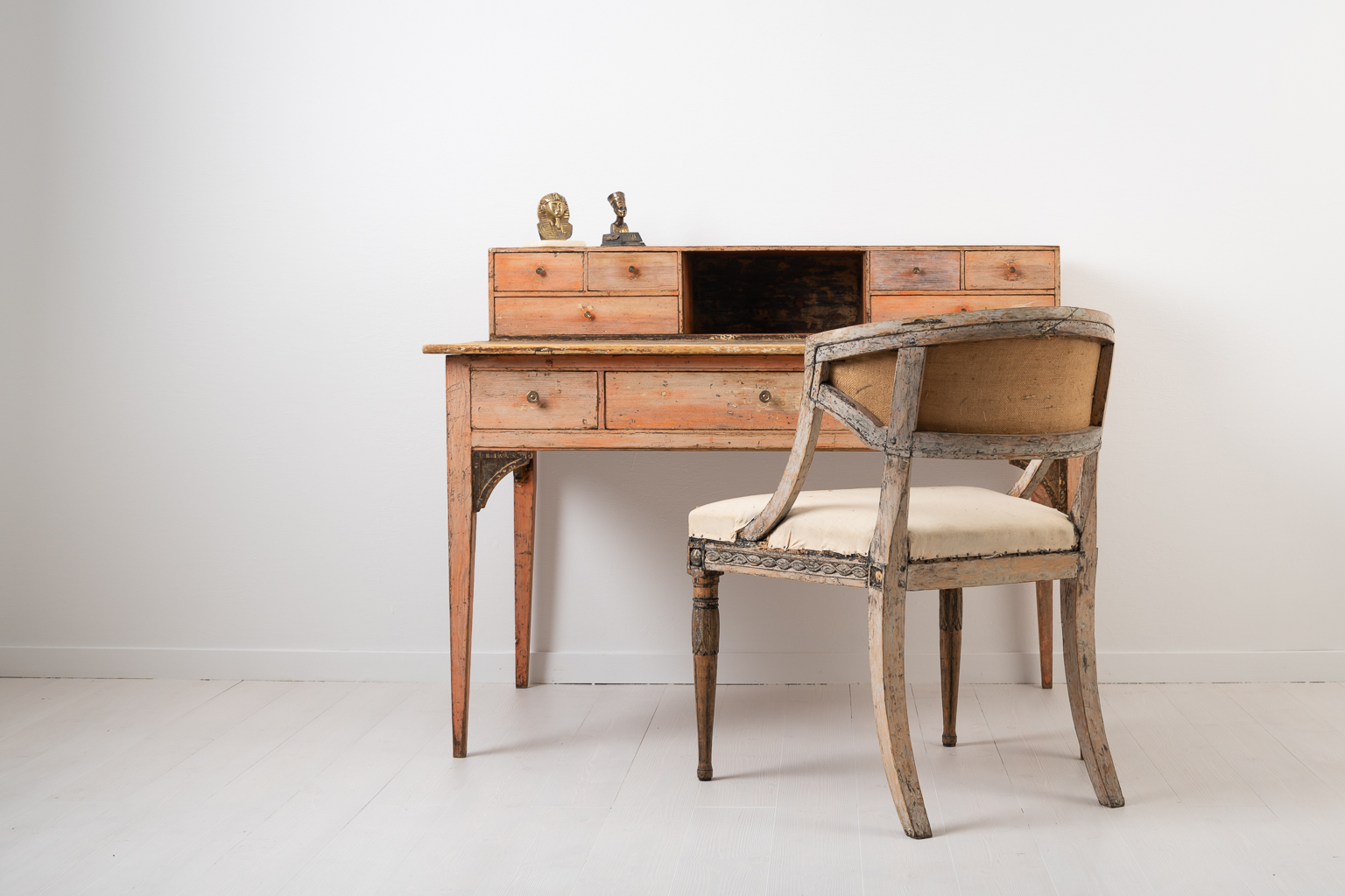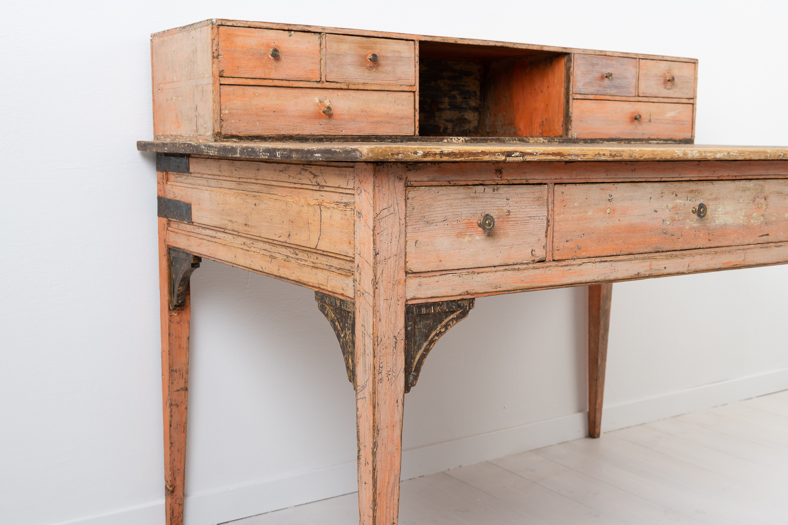 Unusual neoclassical writing table with a top gallery with drawers on each side. The table is made in northern Sweden around 1790 which is during the Swedish gustavian era. More internationally known as the neoclassical period, both refer to the same time period and the names are simply different between regions. The gallery or additional upper part of this table is an unusual detail. It contains tree drawers on each side and has an open slot in the middle.