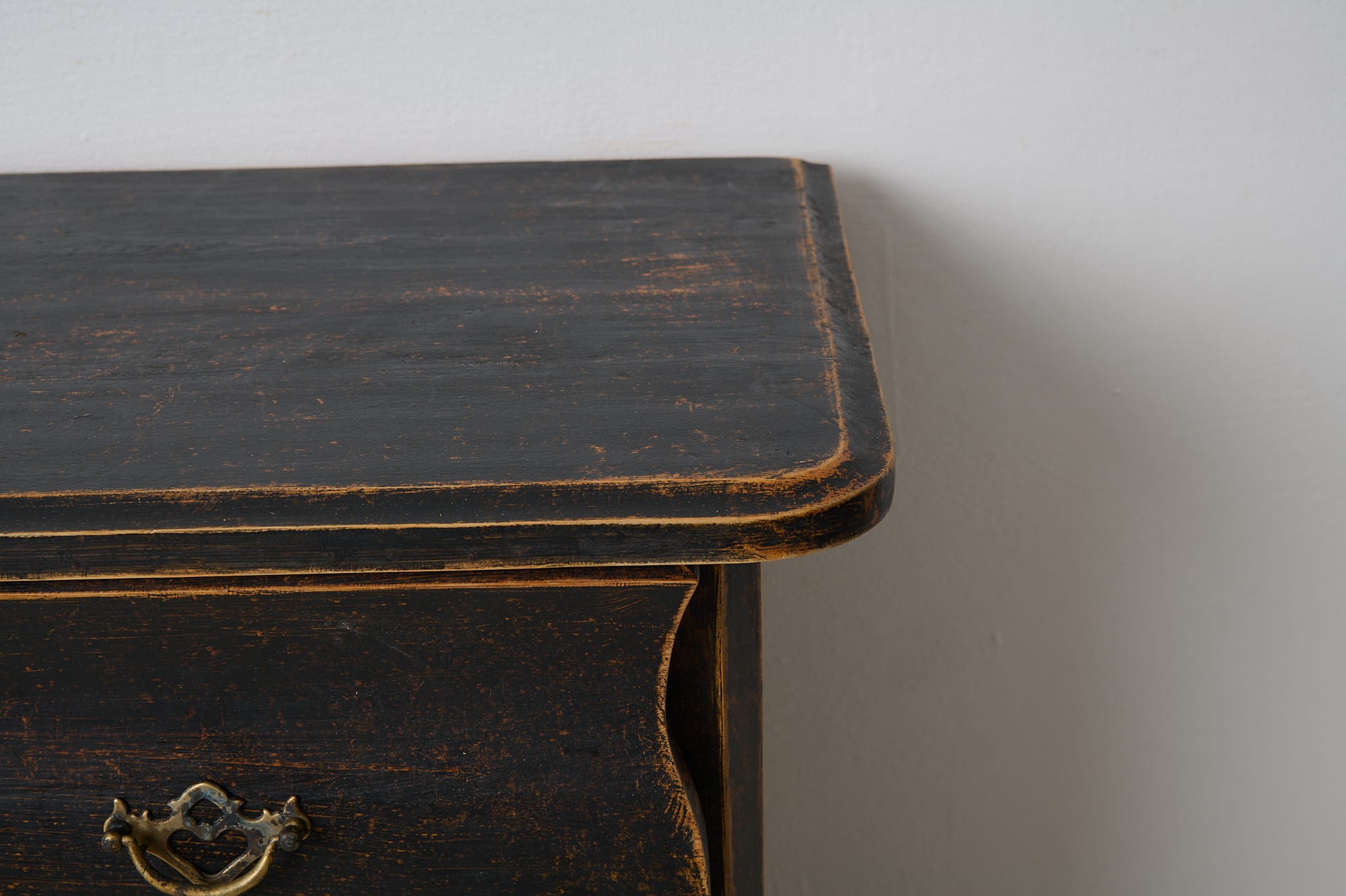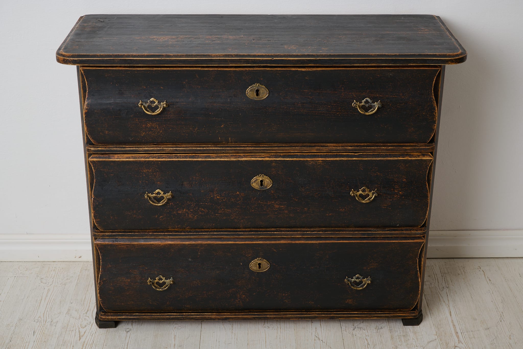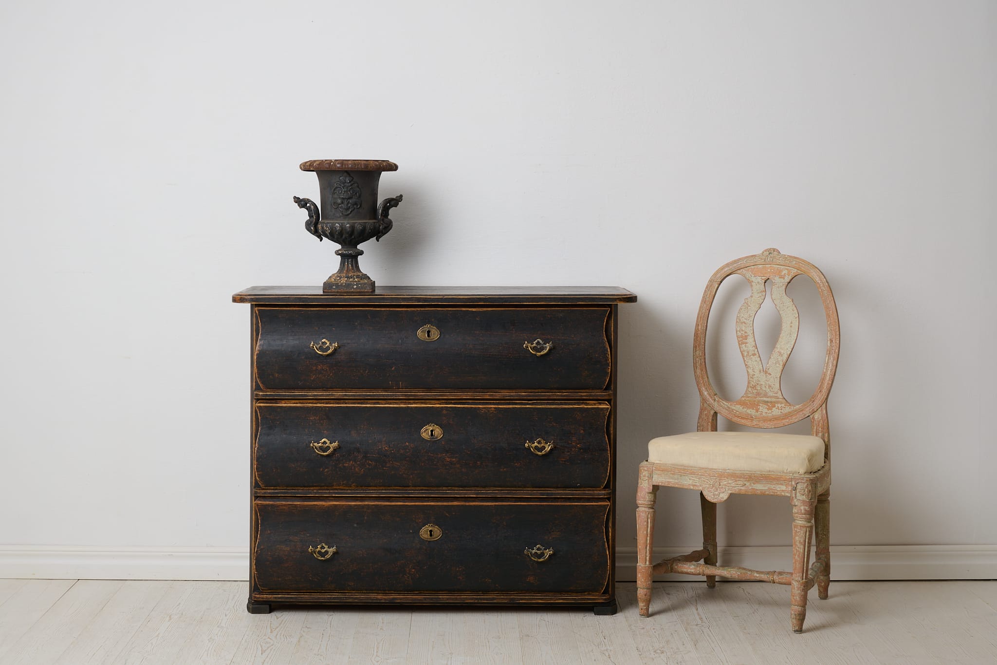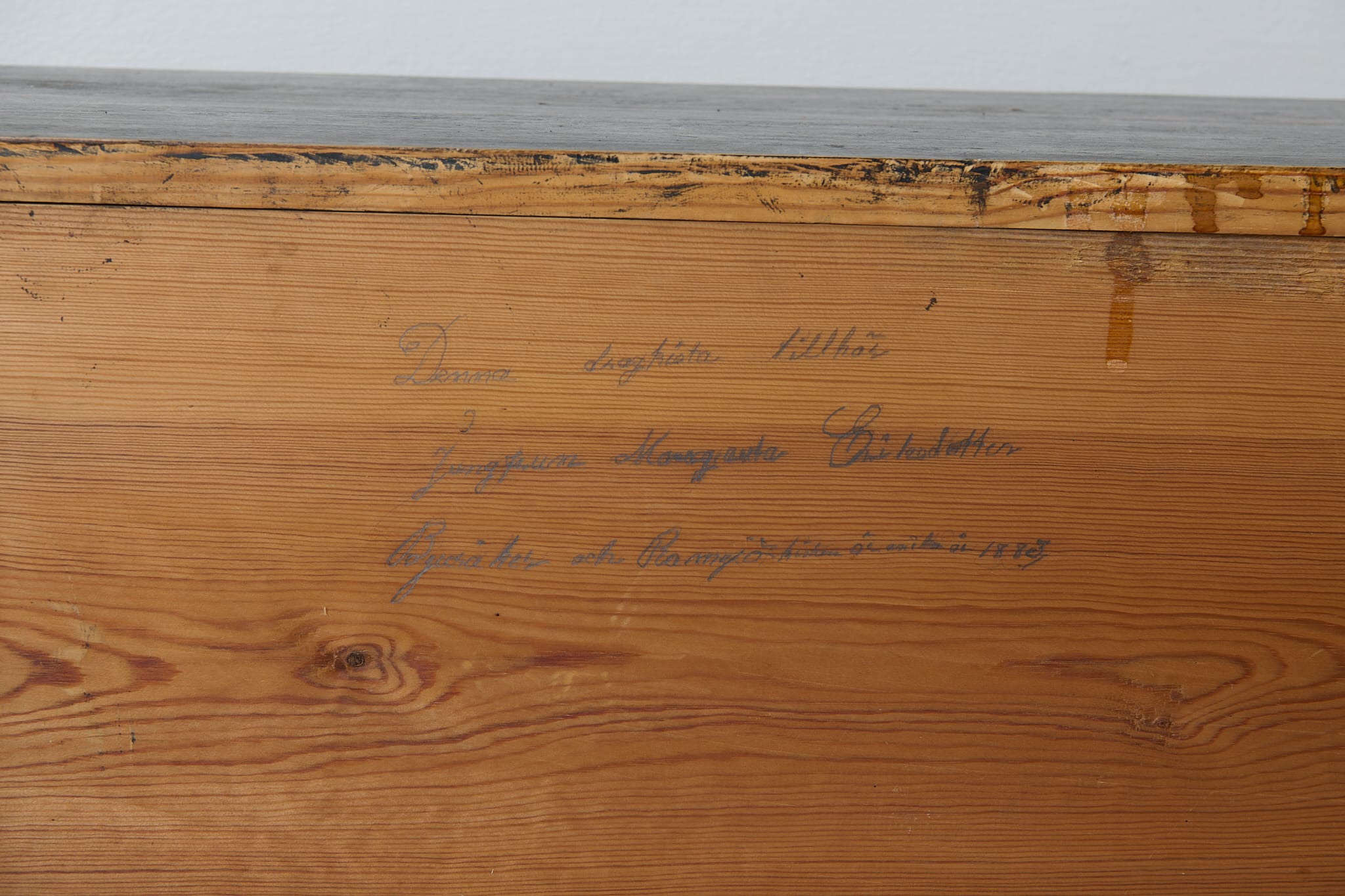 Swedish antique chest of drawers dated 1883. The chest is a country house furniture with three drawers in well-working condition. The inside has never been painted which has resulted in a nice natural patina. Made by hand in solid pine with an inscription on the back, “Bjuråker 1883 till Margareta Eriksdotter”. Healthy and stable frame. Later hardware in brass. The measurements are taken from the table top.