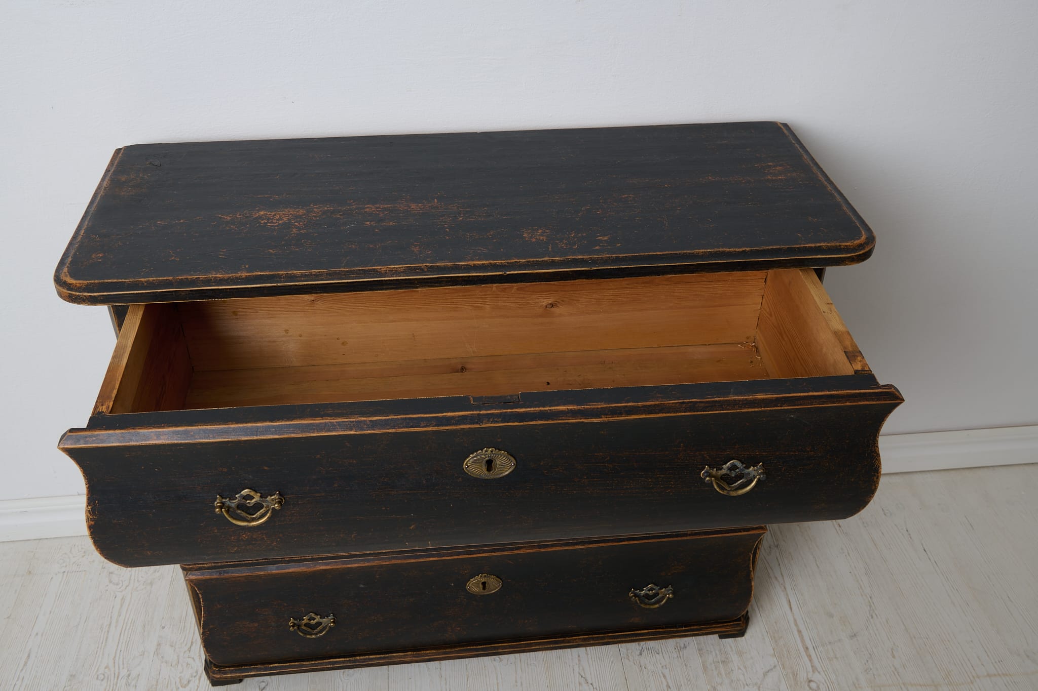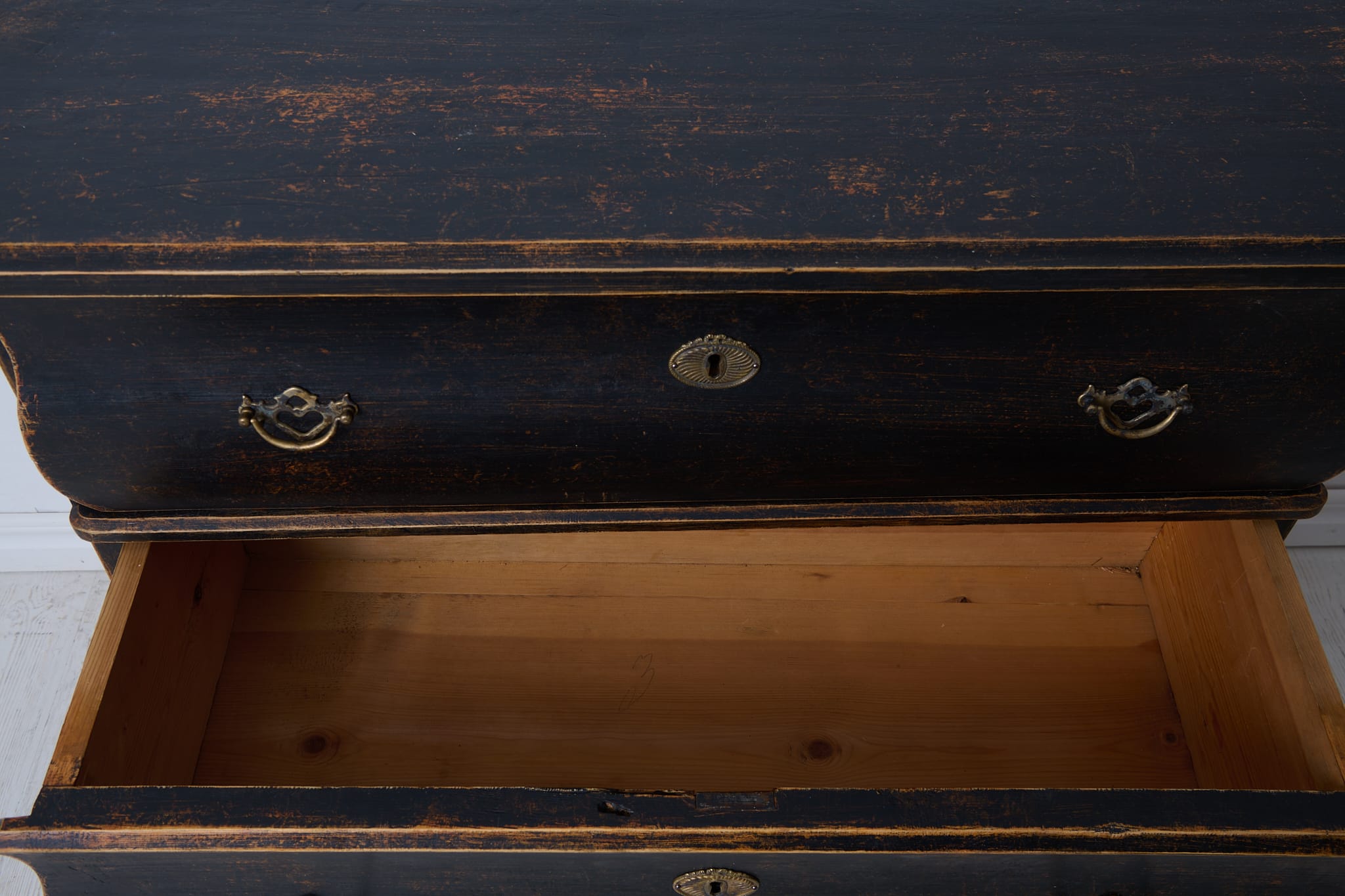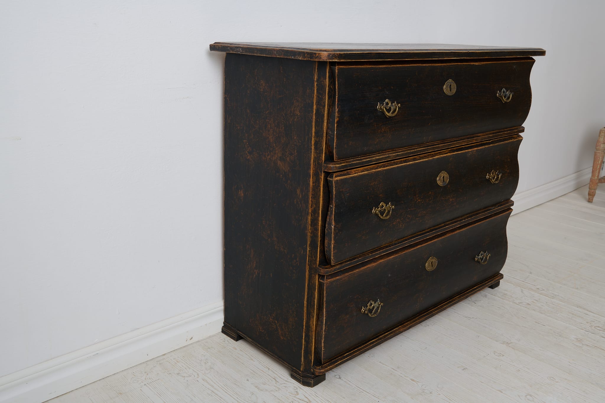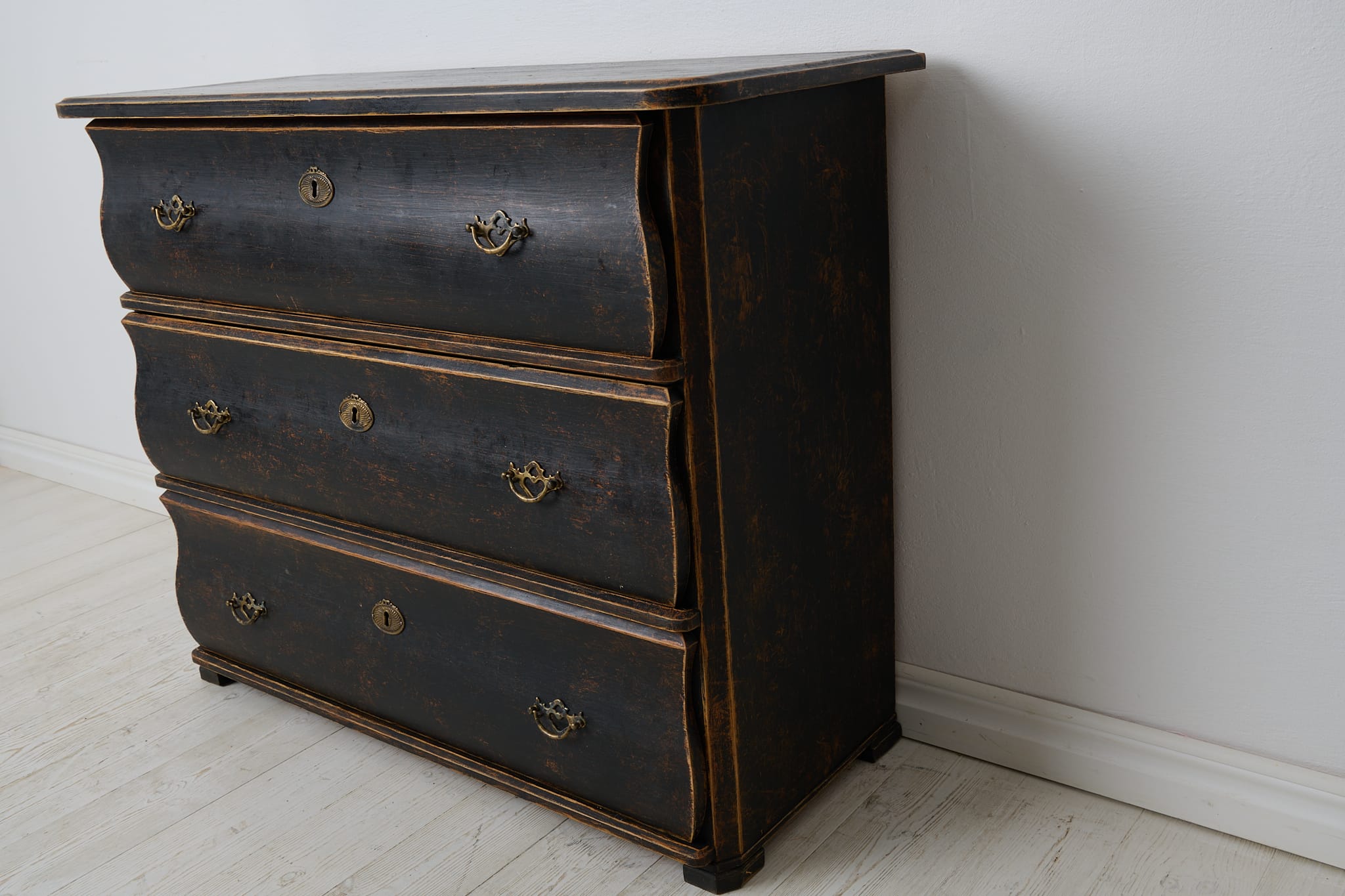 Swedish antique chest of drawers dated 1883. The chest is a country house furniture with three drawers in well-working condition. The inside has never been painted which has resulted in a nice natural patina. Made by hand in solid pine with an inscription on the back, “Bjuråker 1883 till Margareta Eriksdotter”. Healthy and stable frame. Later hardware in brass. The measurements are taken from the table top.