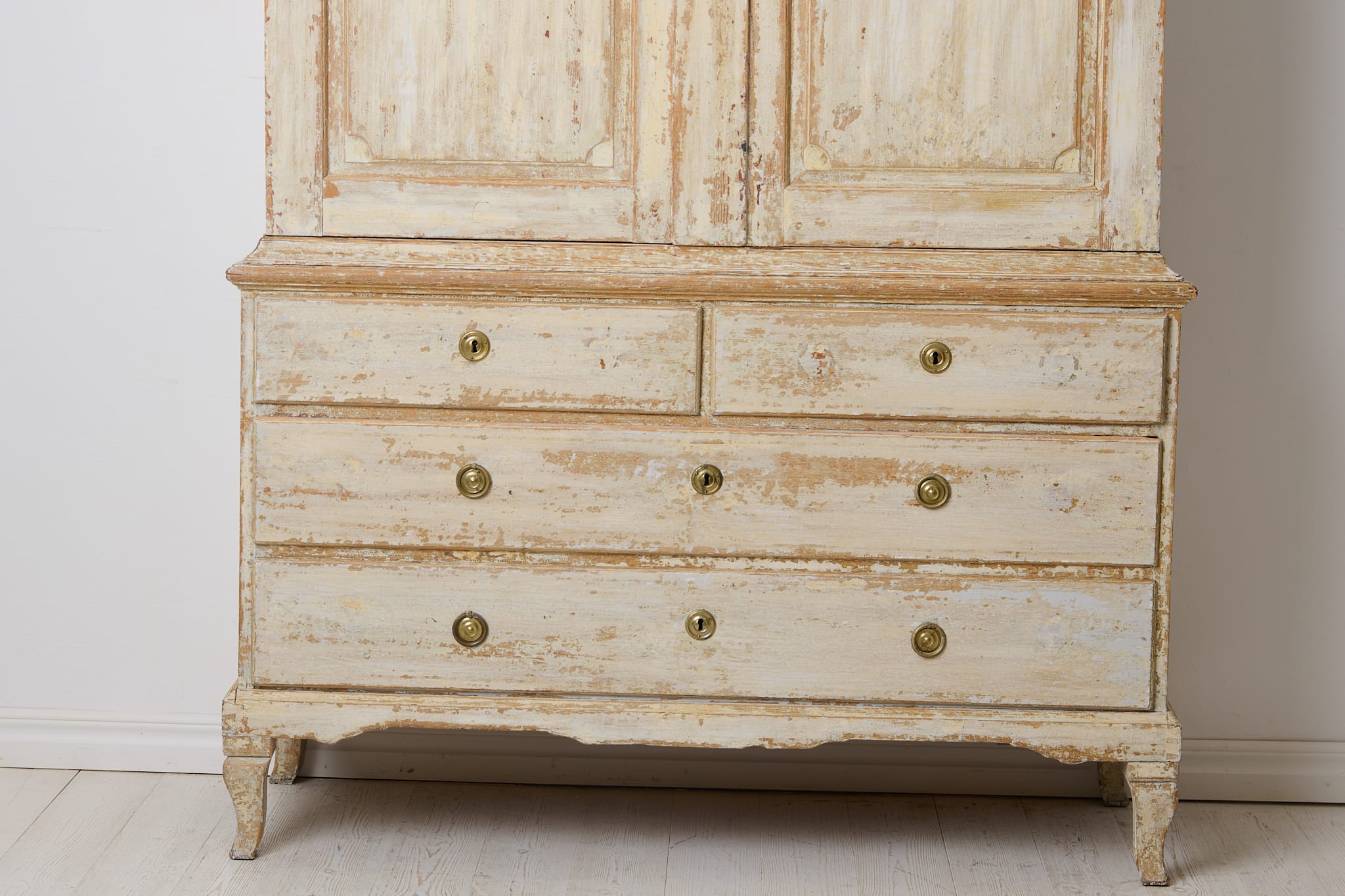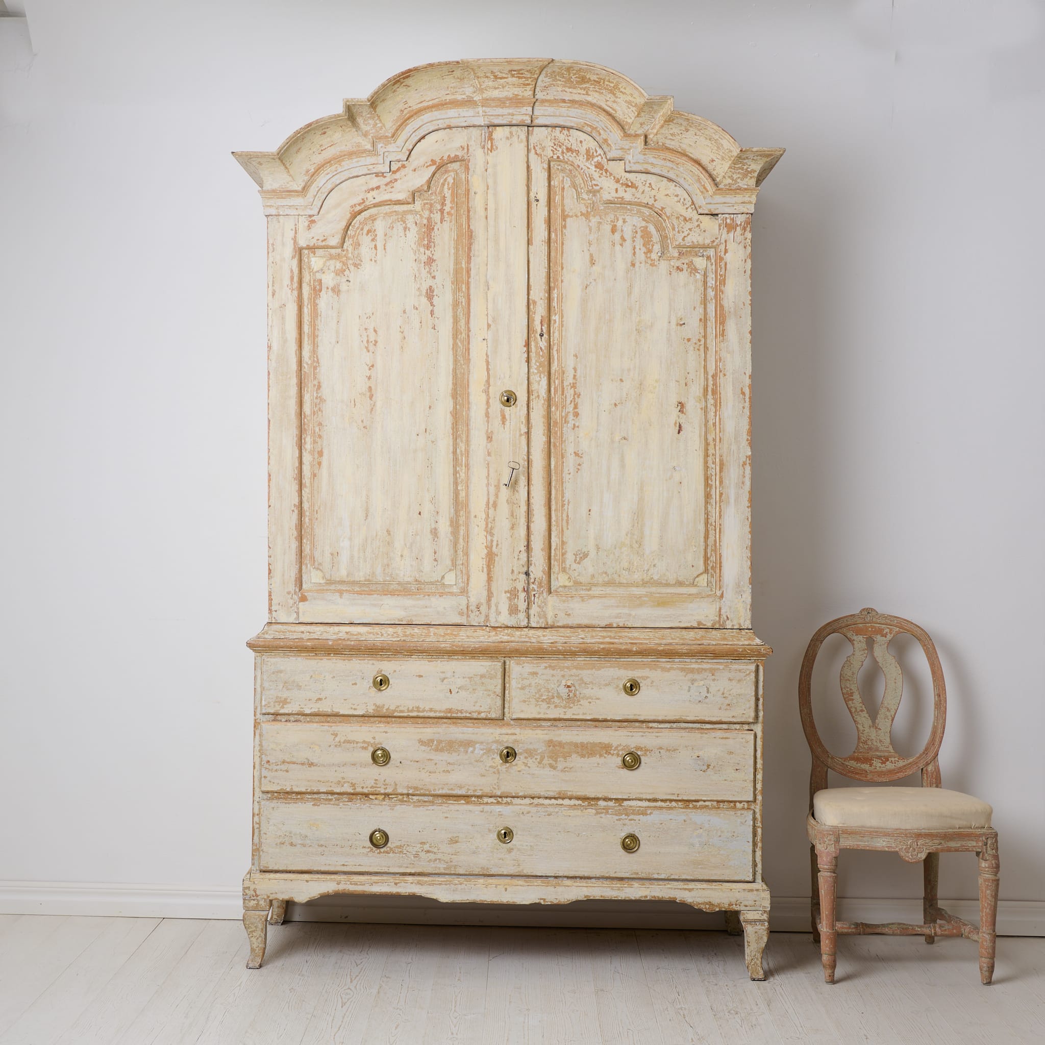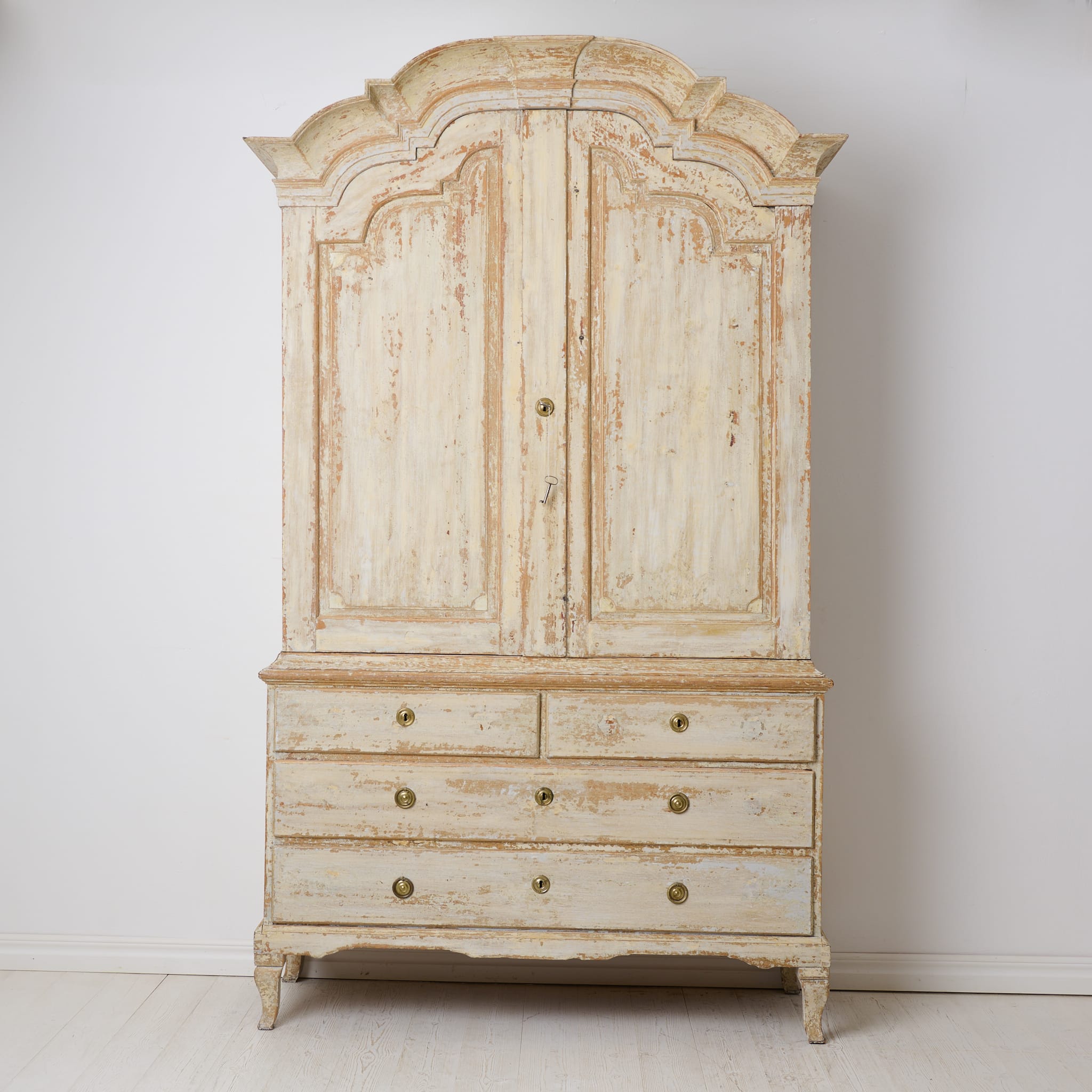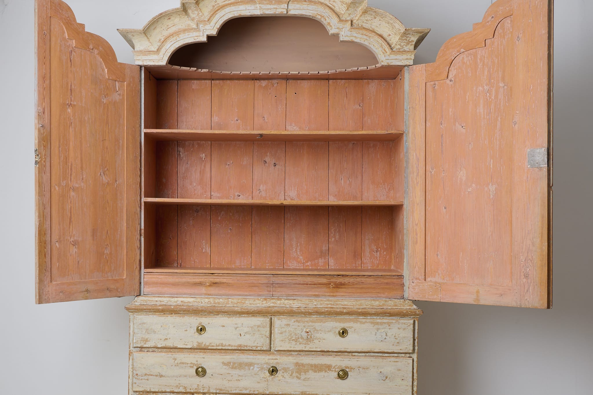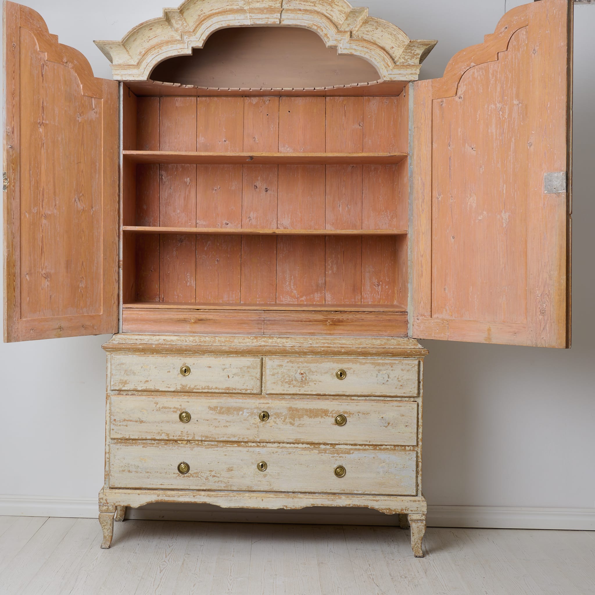 Swedish antique rococo cabinet from the 1700s. The cabinet is genuine Swedish and made by hand in solid pine in northern Sweden around 1780. The surface has been scraped to the original, first layer of paint from the late 1700s with distress and patina as well as traces of use. Functional lock and key. The cabinet is made in three parts: the chest, upper cabinet with shelves and pediment. Healthy and stable with functional doors and drawers. The measurements are taken from the pediment.