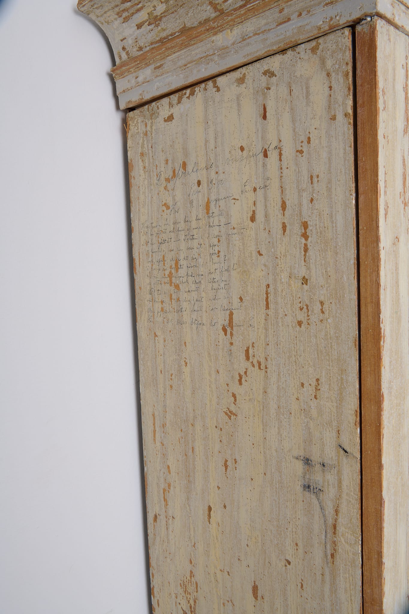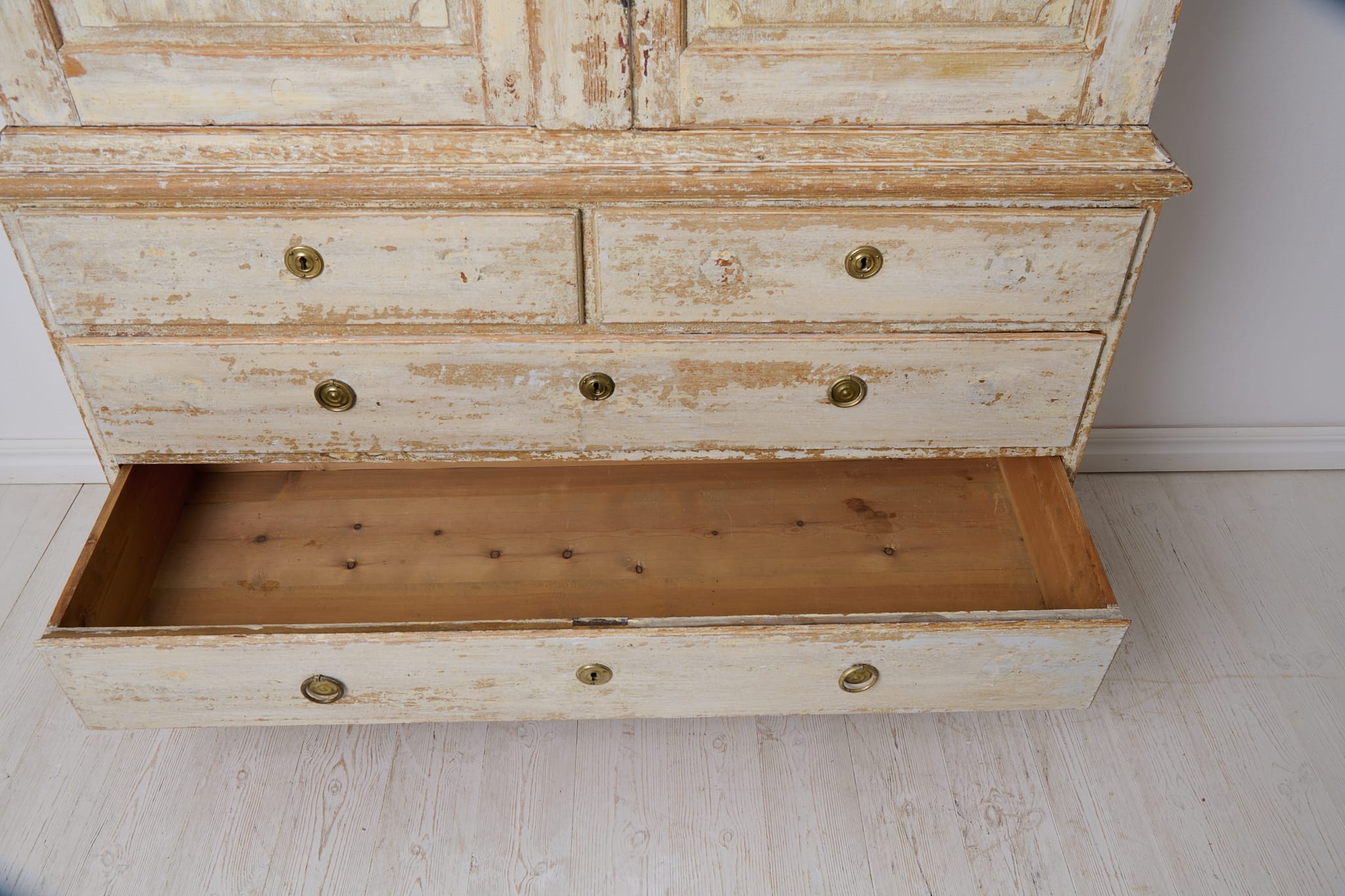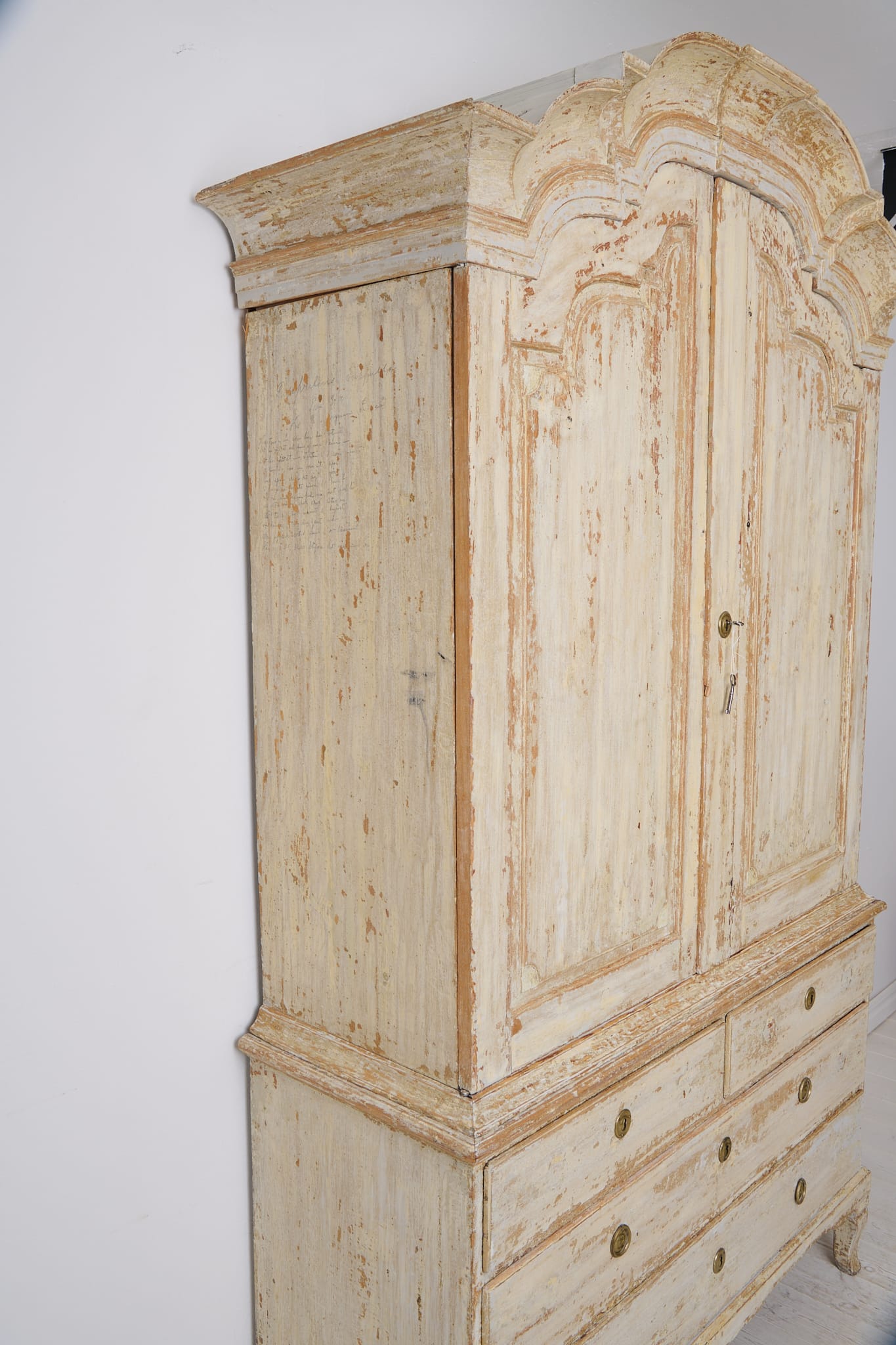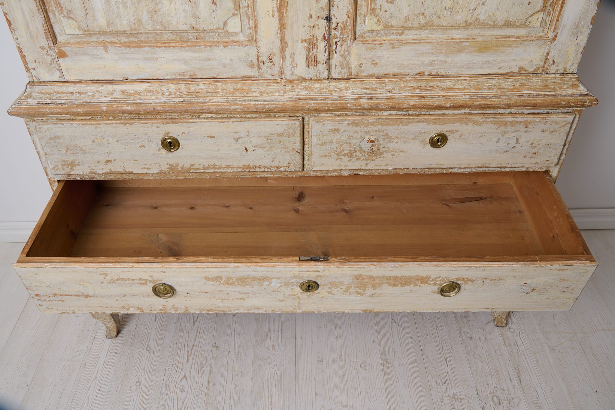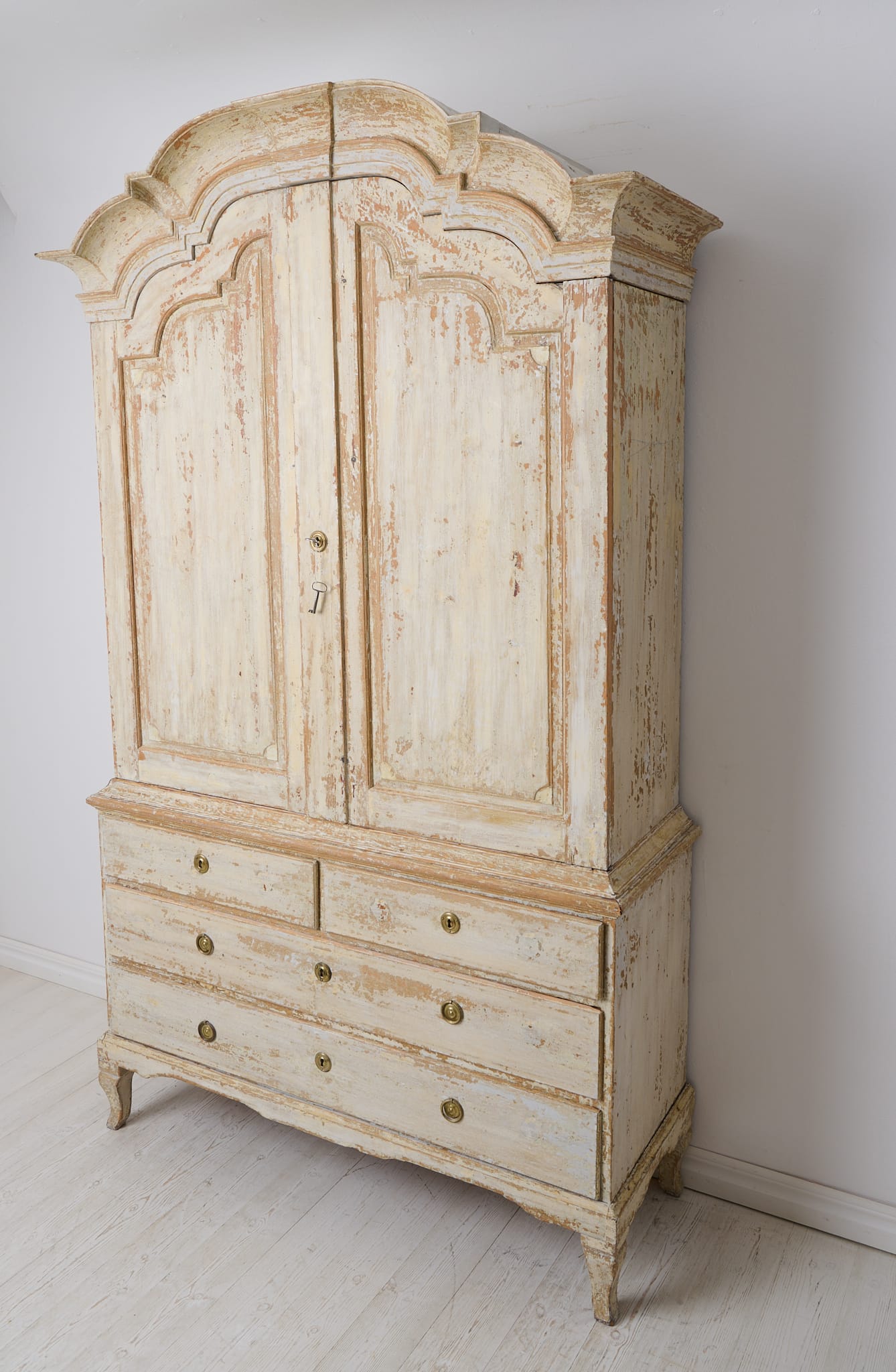 Swedish antique rococo cabinet from the 1700s. The cabinet is genuine Swedish and made by hand in solid pine in northern Sweden around 1780. The surface has been scraped to the original, first layer of paint from the late 1700s with distress and patina as well as traces of use. Functional lock and key. The cabinet is made in three parts: the chest, upper cabinet with shelves and pediment. Healthy and stable with functional doors and drawers. The measurements are taken from the pediment.
