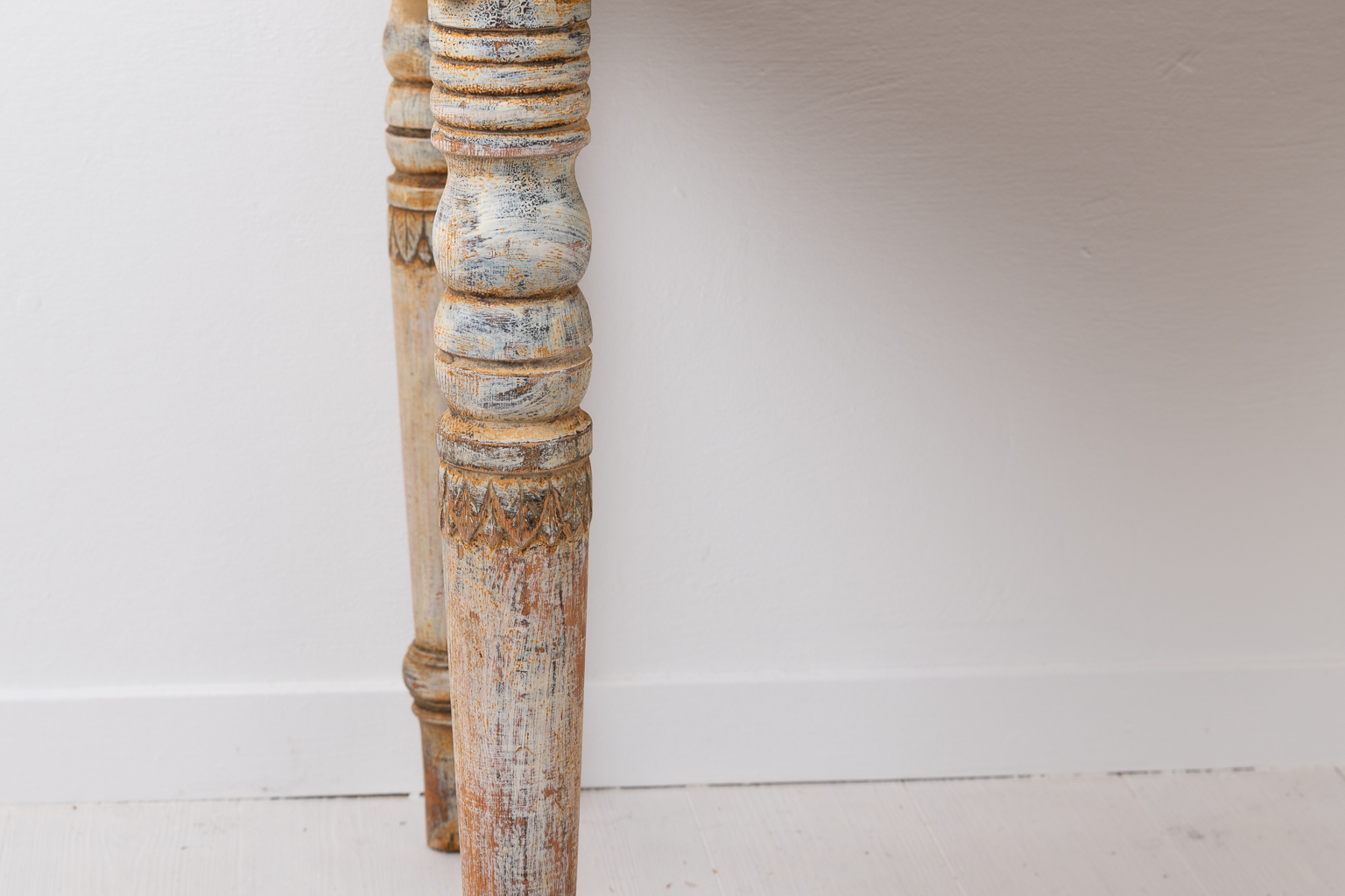 Swedish desk or side table with round legs and decorations. The desk has one drawer with an unusual carved wooden key plate. The table top has a profile going all around the edge which adds some more details in addition to the carvings on the legs. Made in northern Sweden around 1870 to 1880. Healthy and solid frame. Height to rim is 58 cm.