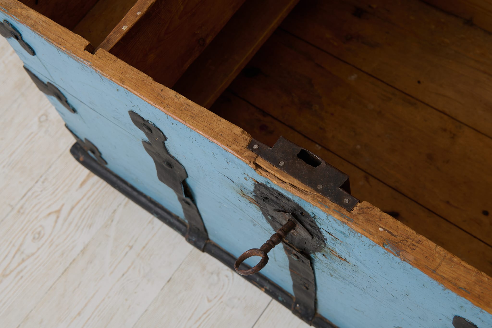 Swedish folk art trunk from the mid 1800s. The trunk is made in northern Sweden and has old historic paint with initials and dating – 1875 – on the lid. The last letter of the initials is a D which indicates that the first owner was a woman and it’s possible this trunk was a wedding gift as it has both the initials and a date. Frame in solid pine enforced with hand-wrought iron hardware. Wood-bare interior which has never been painted. Original working lock and key. Good vintage condition with some smaller marks and traces of use.