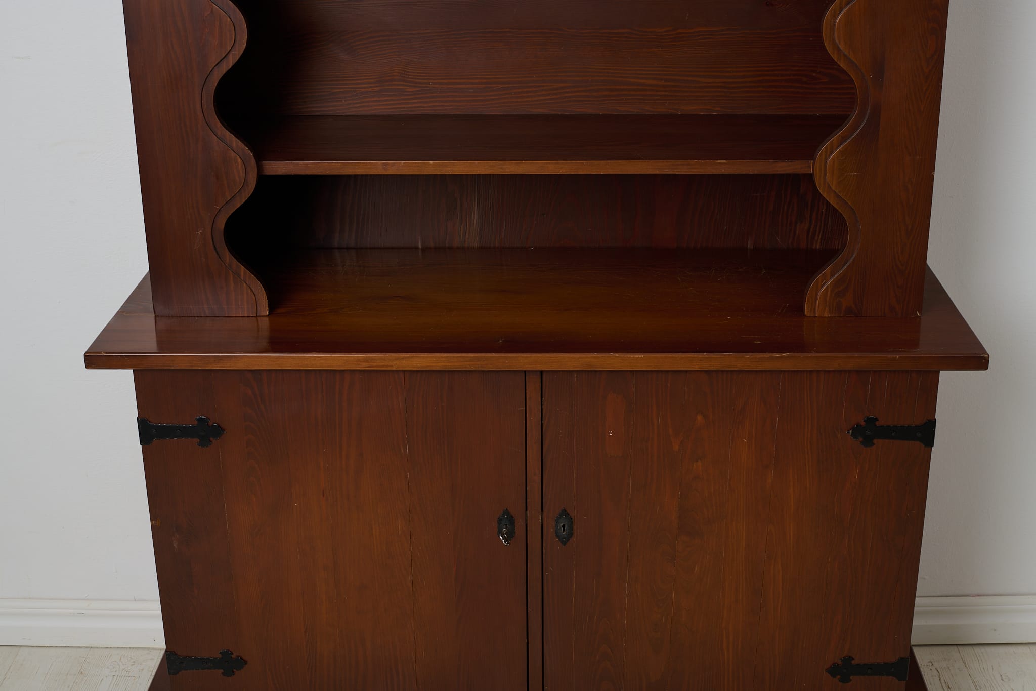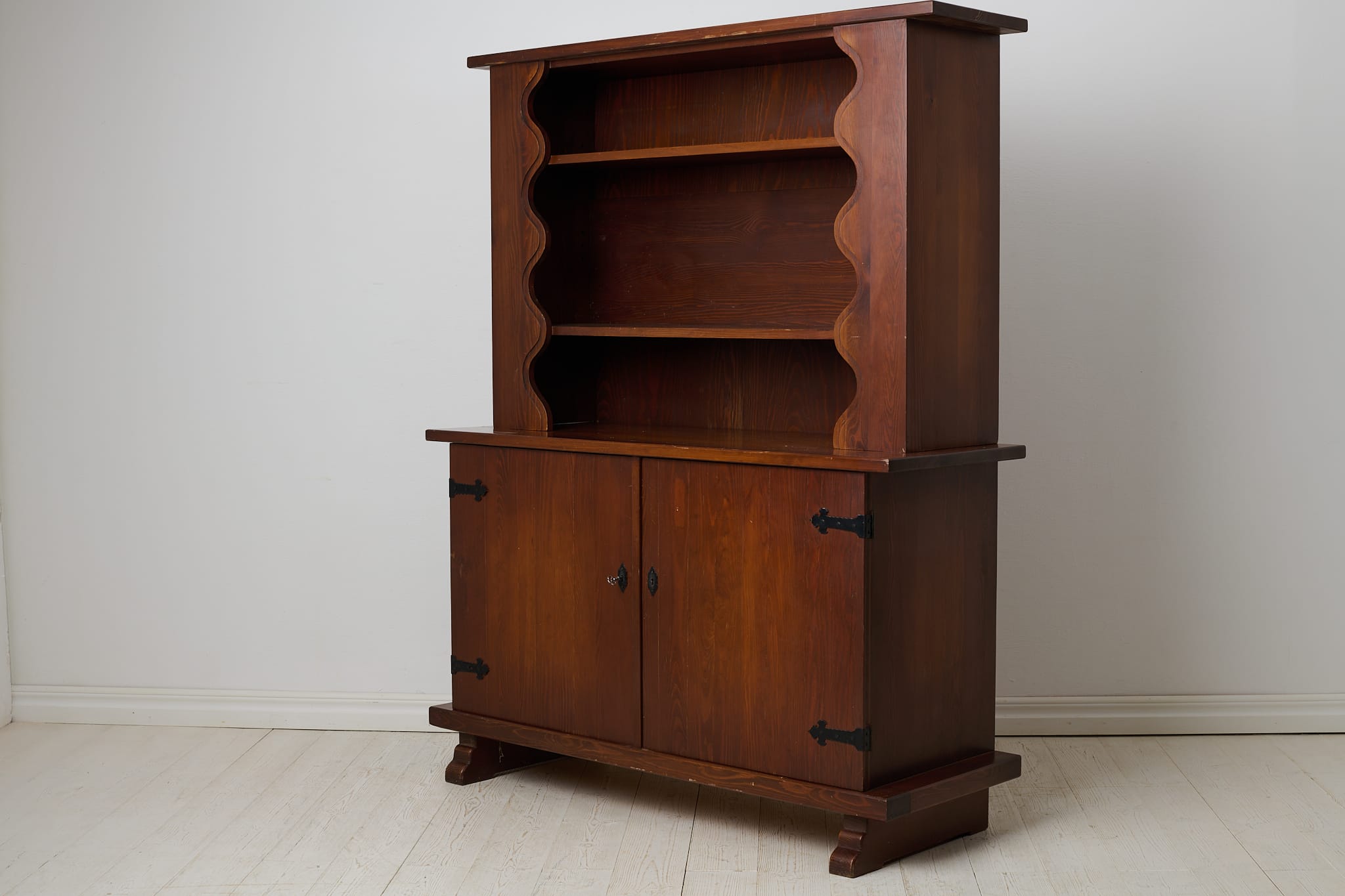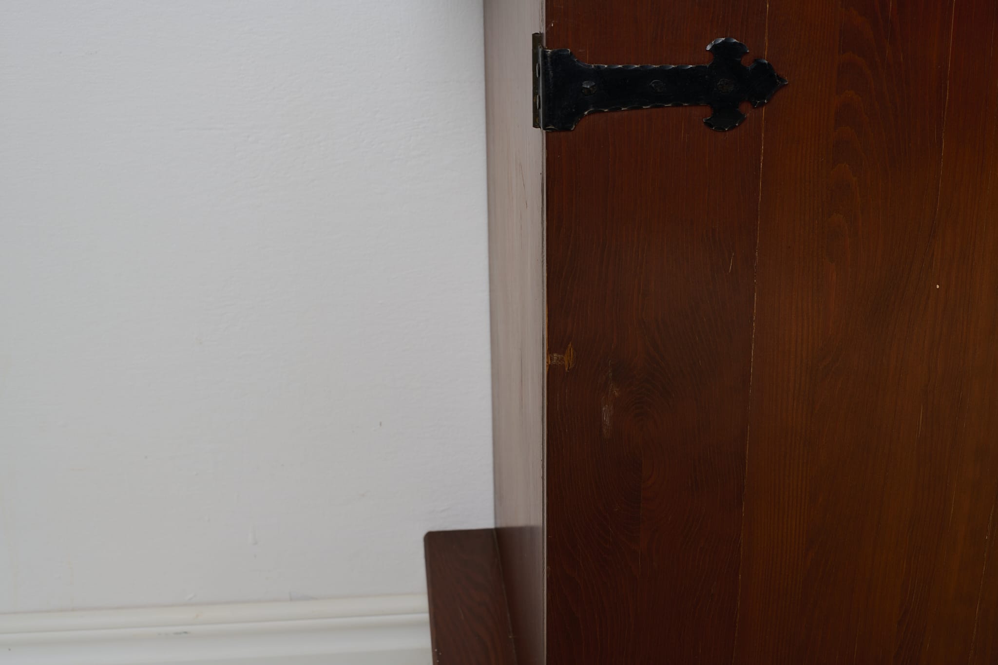 Frame in solid stained pine and wrought iron hardware. The upper cabinet has shelves and the lower cabinet doors. The cabinet is made in two parts. Good vintage condition with minor traces of use. Some smaller vertical cracks in the doors of the lower cabinet, this because the pine has dried with time, but nothing that affects function or stability.