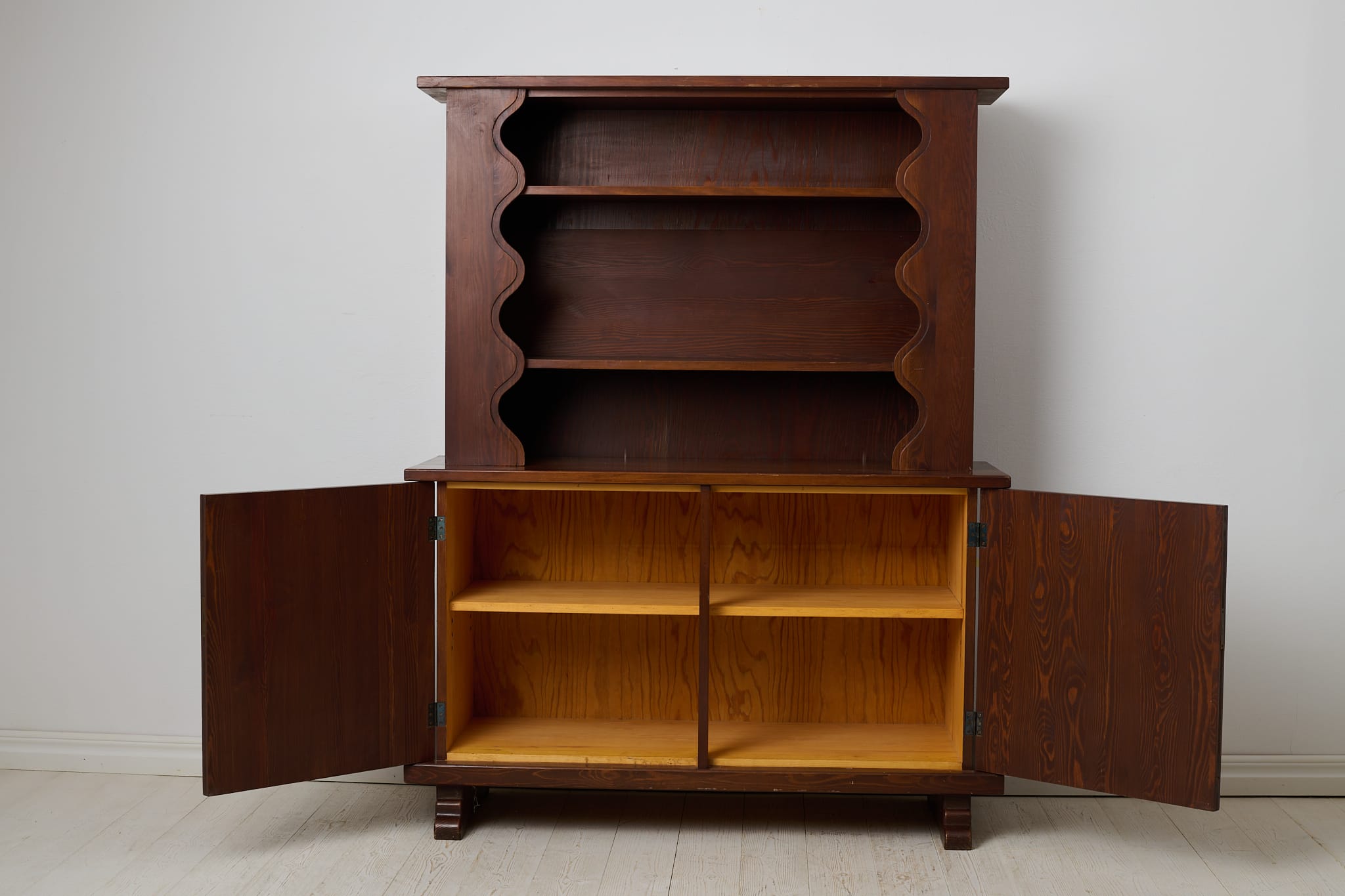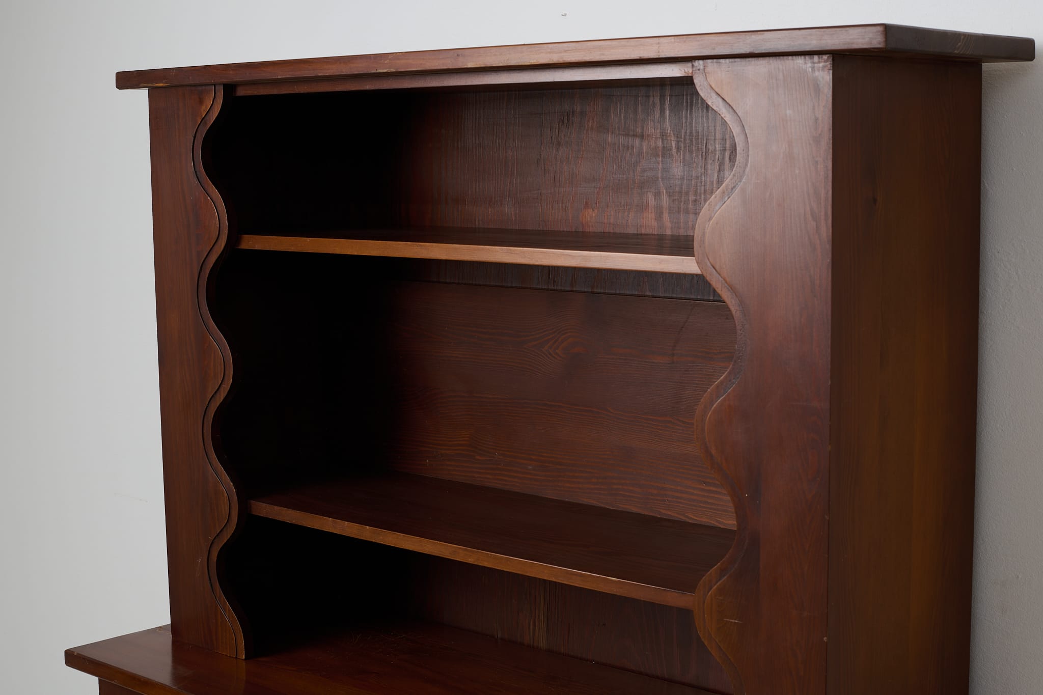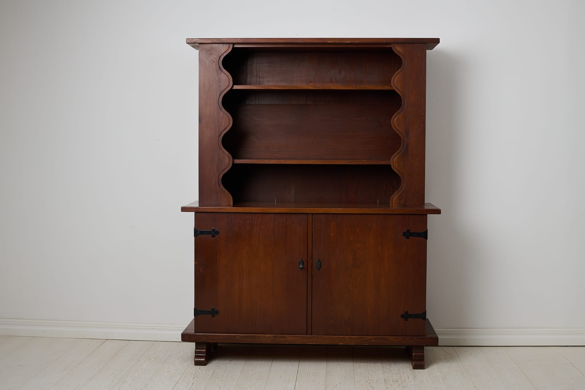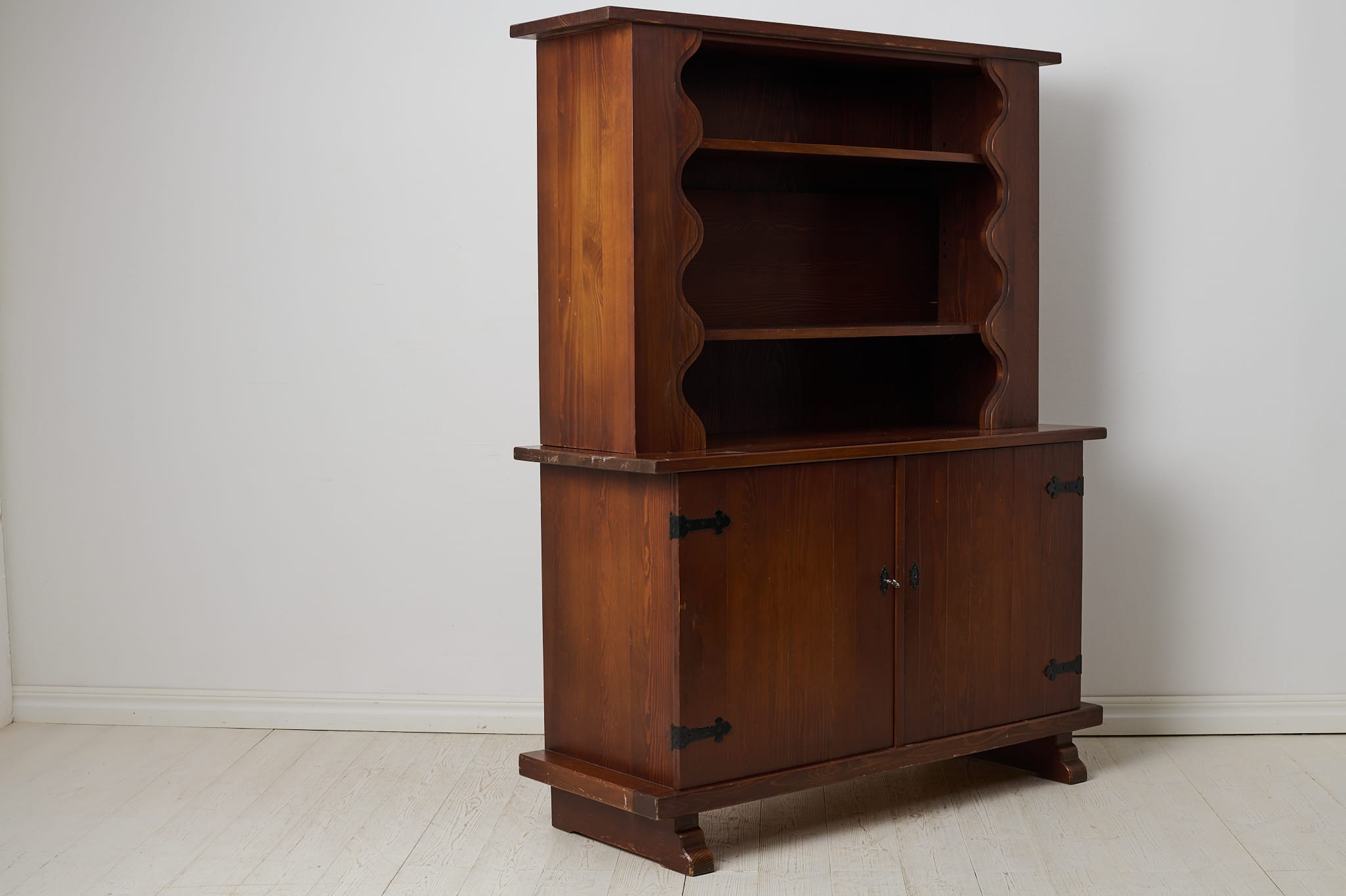 Frame in solid stained pine and wrought iron hardware. The upper cabinet has shelves and the lower cabinet doors. The cabinet is made in two parts. Good vintage condition with minor traces of use. Some smaller vertical cracks in the doors of the lower cabinet, this because the pine has dried with time, but nothing that affects function or stability.